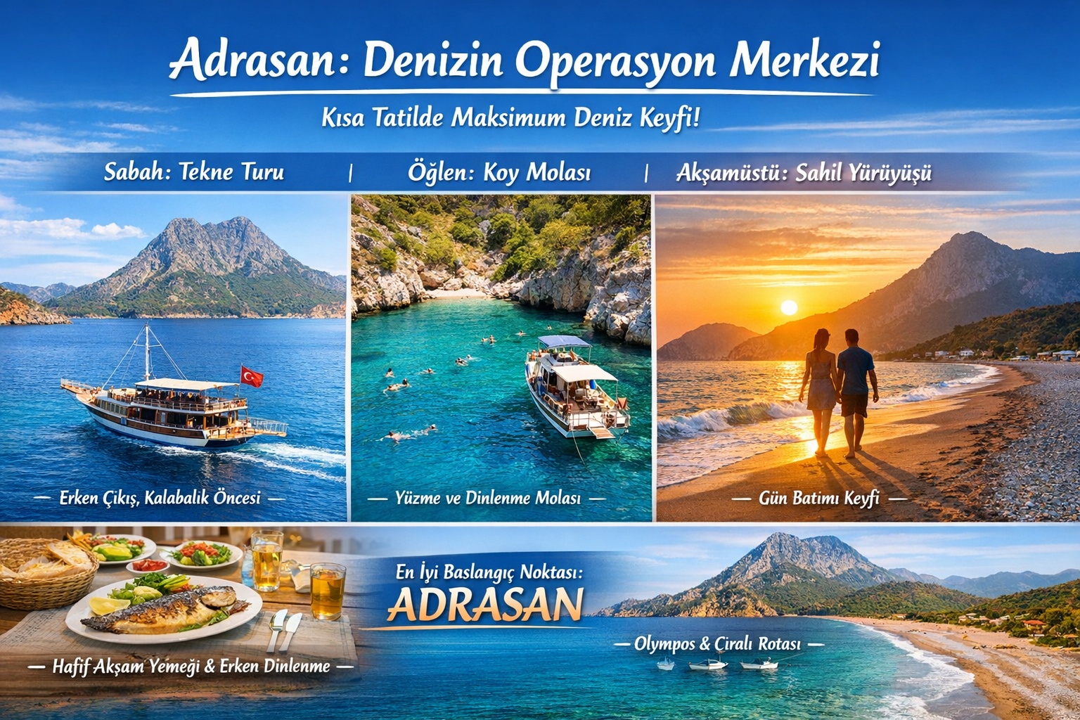 Adrasan tarafında temel hedef; deniz gününü tek aktiviteye sıkıştırmadan büyütmek olmalı. Burada en yüksek verim; sabah erken başlayan bir tekne planı, öğlen deniz molaları ve akşamüstü sahil bandında dinlenme akışıyla gelir.