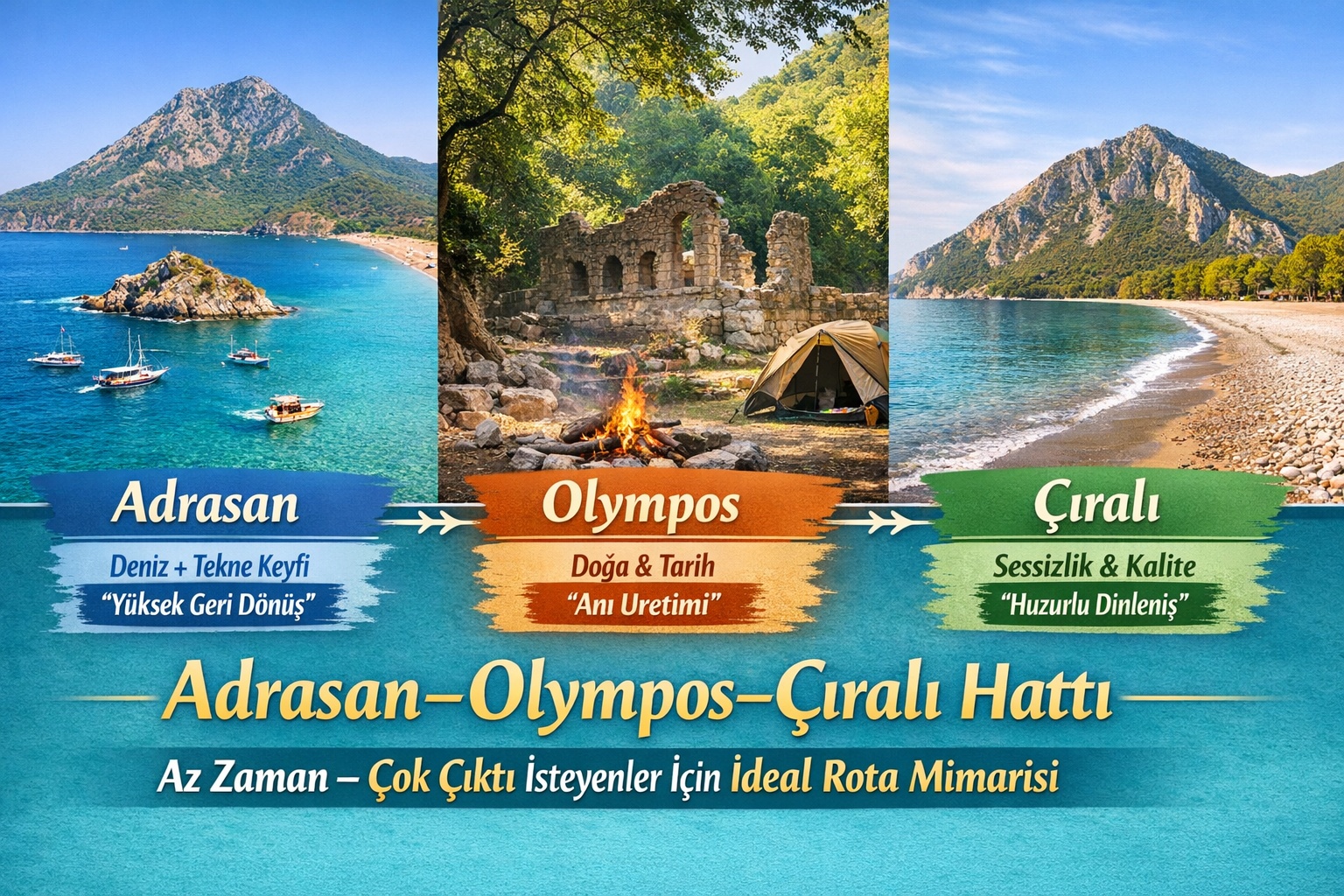 Bu nedenle Adrasan–Olympos–Çıralı hattı, 2–4 gün aralığında “az zaman–çok çıktı” isteyenler için ideal bir rota mimarisidir.