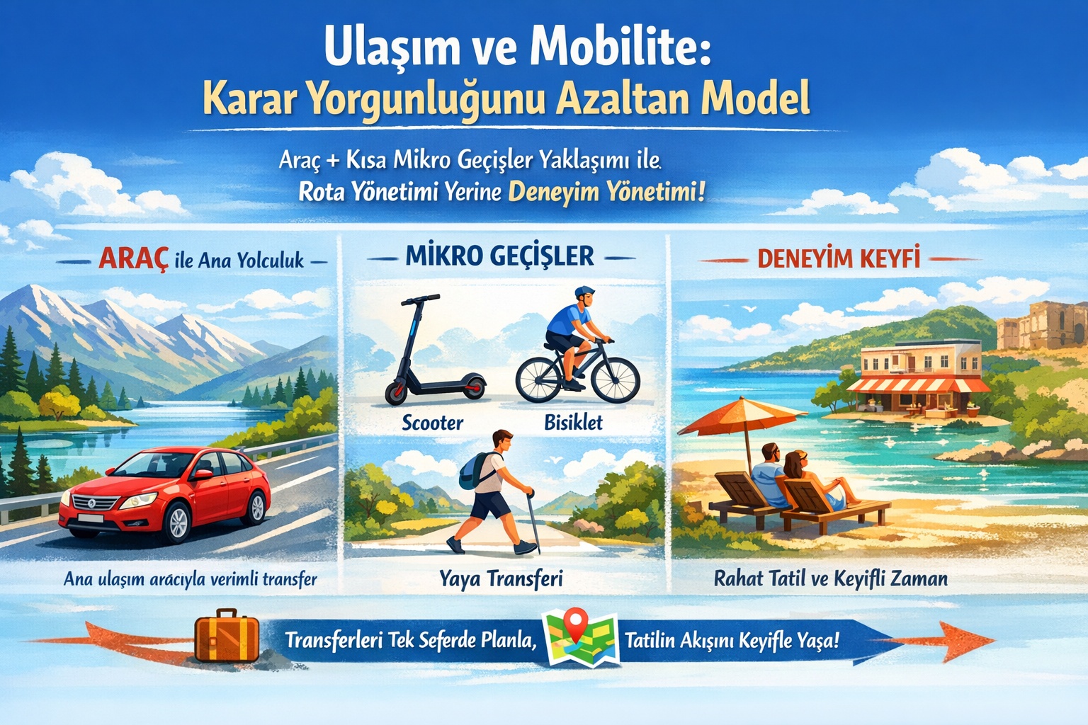 Bu hatta en verimli model; araç + kısa mikro geçişler yaklaşımıdır. Böylece gün içinde “rota yönetimi” yerine “deneyim yönetimi” yaparsınız. Transferleri tek sefer planlayıp günleri içeride stabilize ettiğinizde, tatilin akış kalitesi artar.