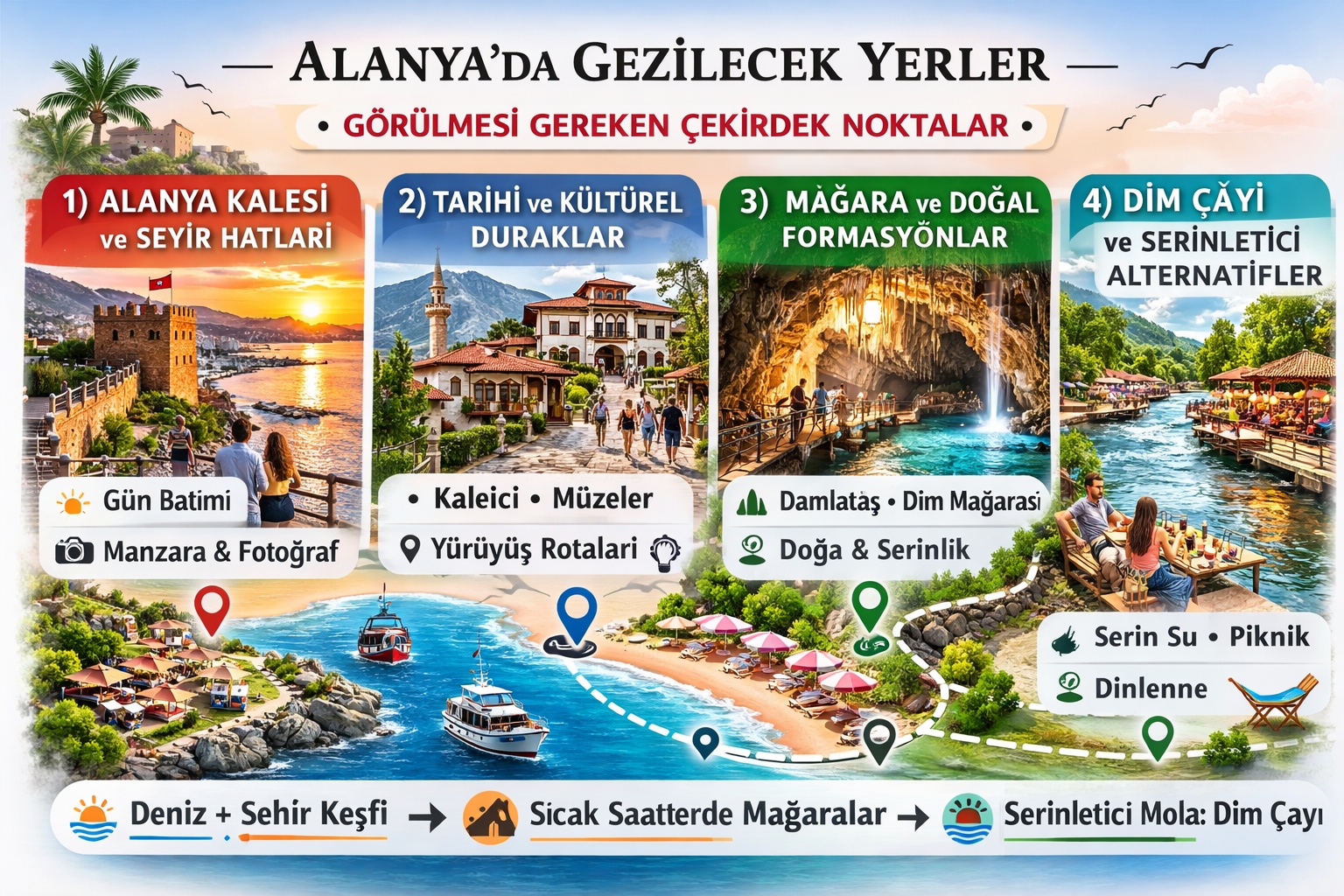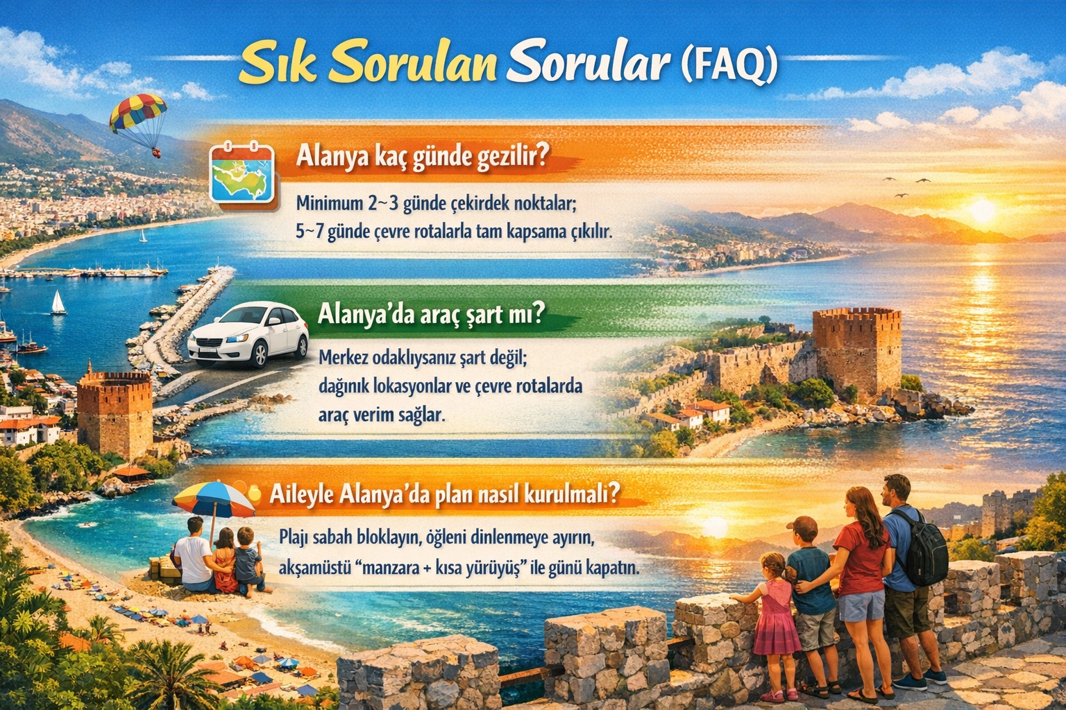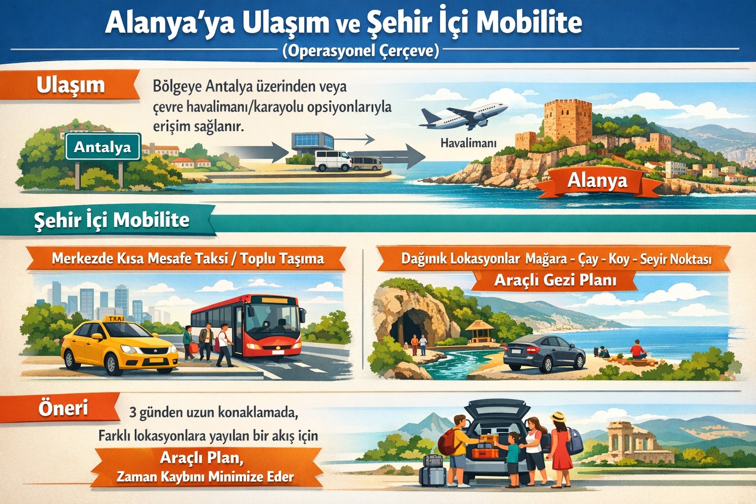 * Şehir içi mobilite: Alanya’da planınız “sadece merkez” ise kısa mesafe taksi/toplu taşıma; “mağara–çay–koy–seyir noktası” gibi dağınık lokasyonlar varsa araçlı plan daha kontrollüdür.