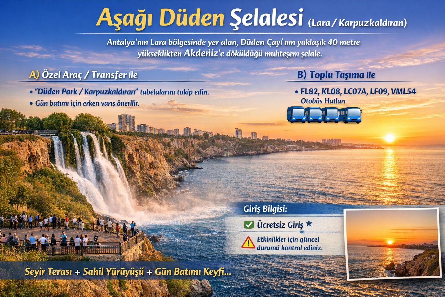 Lara sahil hattına yönlenerek “Düden Park / Karpuzkaldıran” tabelalarıyla ilerleyebilirsiniz. Bu lokasyonda özellikle gün batımı saatlerinde yoğunluk olabildiği için erken varış yaklaşımı, park ve seyir noktalarında “daha iyi deneyim” sağlar.