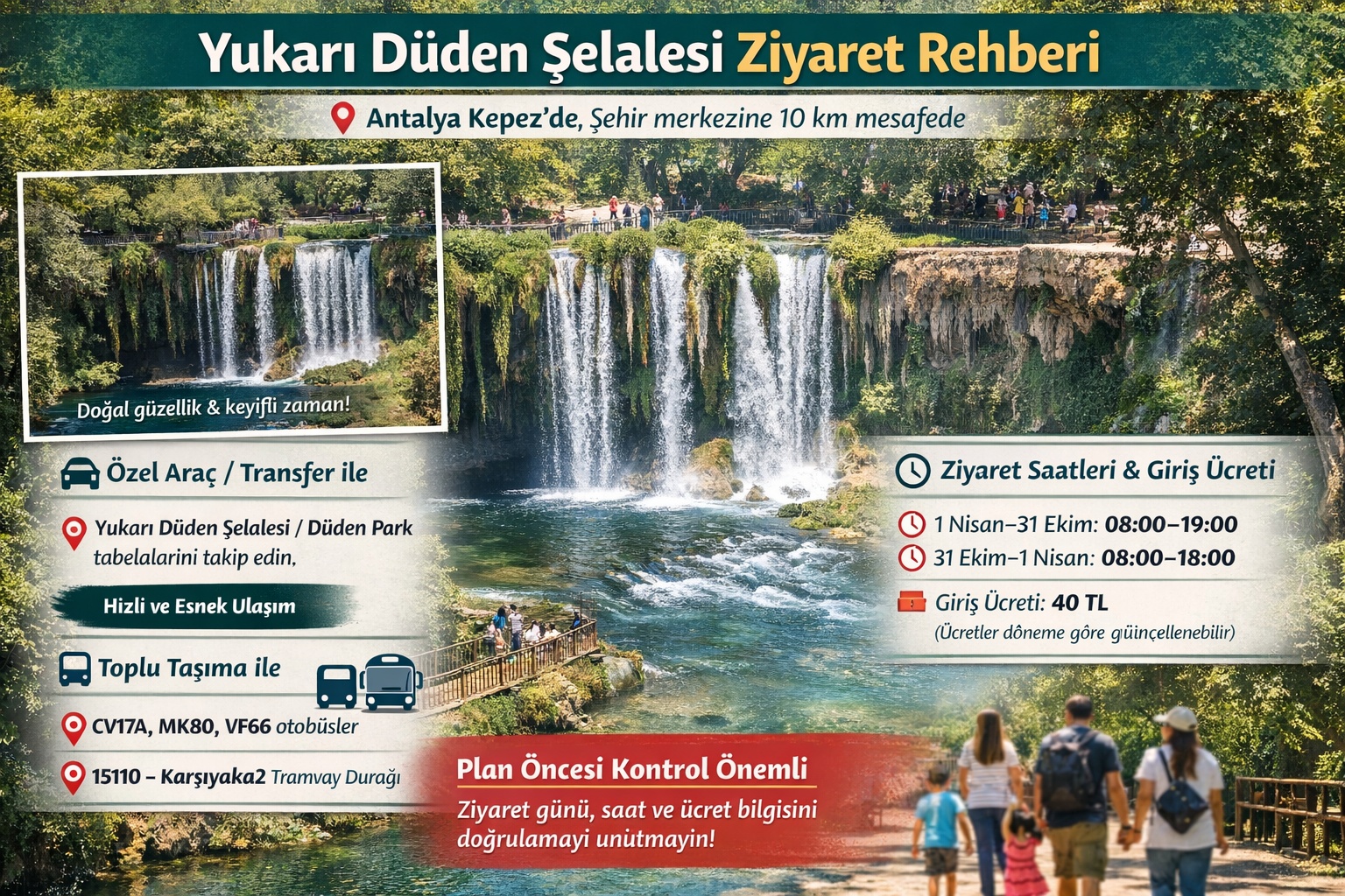 Kepez yönüne ilerleyerek “Yukarı Düden Şelalesi / Düden Park” tabelalarını takip edebilirsiniz. Garanti Villam misafir deneyiminde bu yöntem, özellikle zaman yönetimi + esneklik açısından en doğru senaryodur (bebek/çocuk, kalabalık aile, gün içinde birden fazla durak planı vb.).