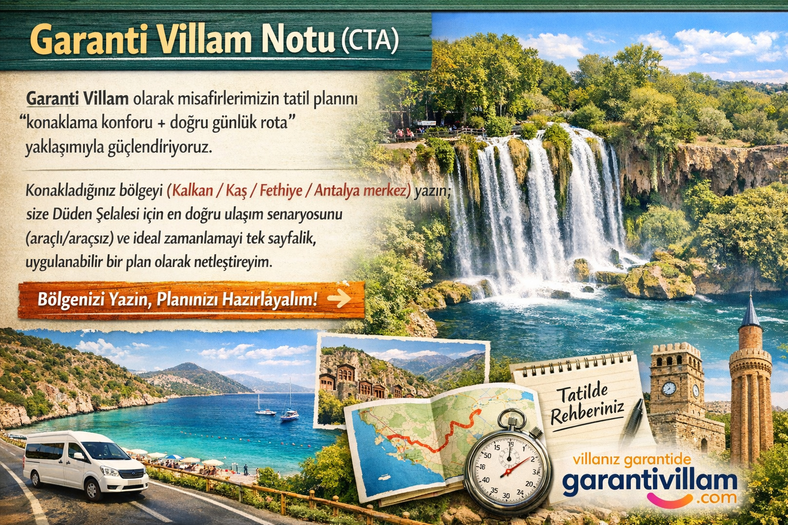 Garanti Villam olarak misafirlerimizin tatil planını “konaklama konforu + doğru günlük rota” yaklaşımıyla güçlendiriyoruz. Konakladığınız bölgeyi (Kalkan / Kaş / Fethiye / Antalya merkez) yazın; size Düden Şelalesi için en doğru ulaşım senaryosunu (araçlı/araçsız) ve ideal zamanlamayı tek sayfalık, uygulanabilir bir plan olarak netleştireyim.