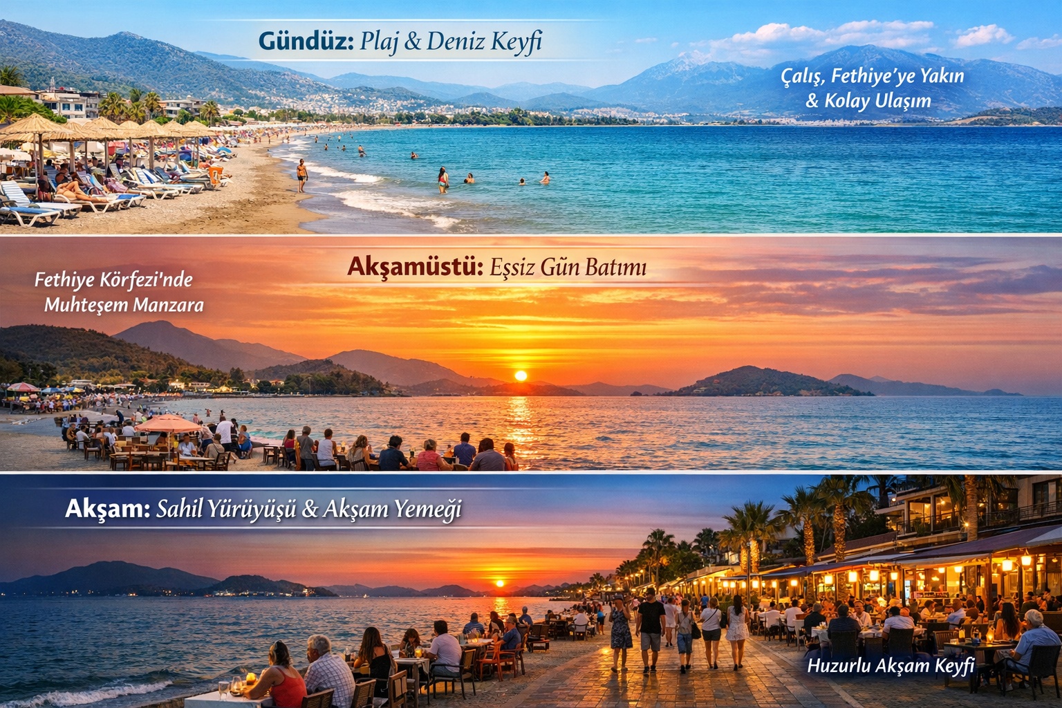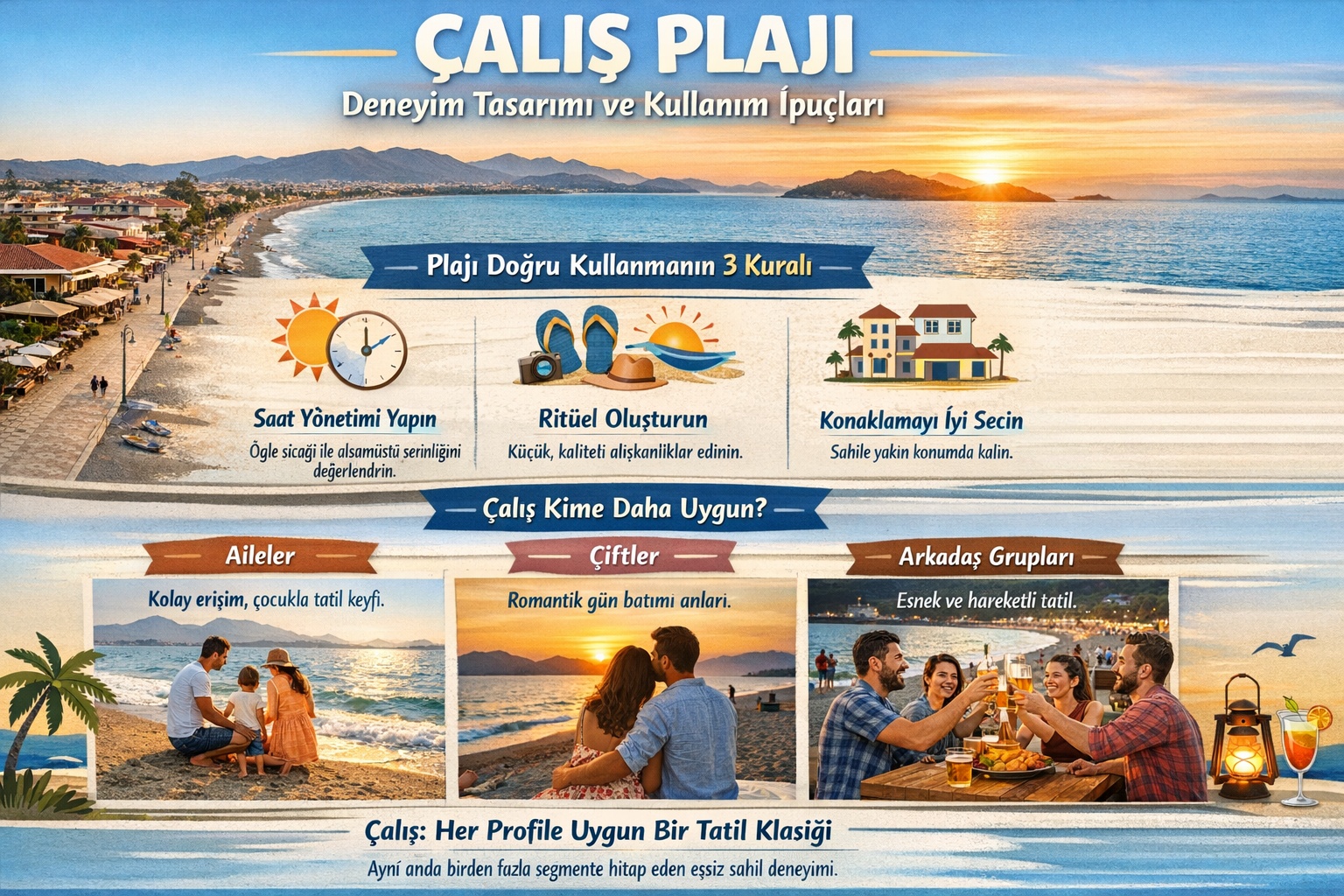 Bu “ritim-keşif-ritim” modeli, tatil sonrası yorgunluğu azaltır; çünkü tatildeki “operasyon”u (taşıma, karar verme, yol) minimize eder. Çalış’ı anlatan geniş Fethiye içeriklerinde de Çalış’ın bu dengeyi sağlayan bir durak olarak geçtiği görülür.
