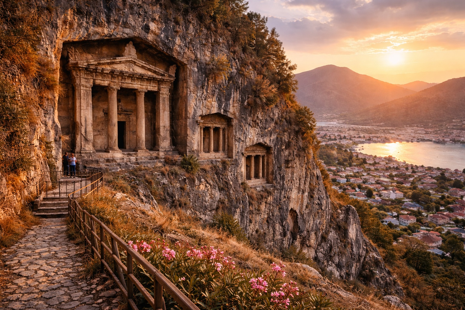Fethiye merkezden yükselen kayalık yamaçta yer alan Amintas Kaya Mezarları, şehrin günlük ritmine dramatik bir parantez açar. Kısa fakat eğimli bir tırmanışla ulaşılan platform, sadece arkeolojik bir durak değil, aynı zamanda panoramik bir seyir noktasıdır. Gün batımına yakın saatlerde taşın rengi ısınır, oyuklar daha belirginleşir ve gölgeler sahne tasarımcısı gibi çalışır. Aşağıda şehrin ışıkları yanmaya başladığında, antik dünyanın ciddiyeti ile modern hayatın hareketi aynı kadraja girer. Ziyaret için rahat ayakkabı, su ve fotoğraf için sabit bir tutuş önerilir. Kısa ziyaret sonrası Paspatur’a inip eski çarşıda dolaşmak, arkeolojiden günlük hayata yumuşak bir geçiş sağlar. Akşamı sakin kapatmak isterseniz deniz meltemini daha yoğun hissedeceğiniz Kiralık Fethiye Villaları arasından sahile yakın konumlar, yürüyerek ulaşılabilen keyifli bir akşam programı kurmanıza yardımcı olur.