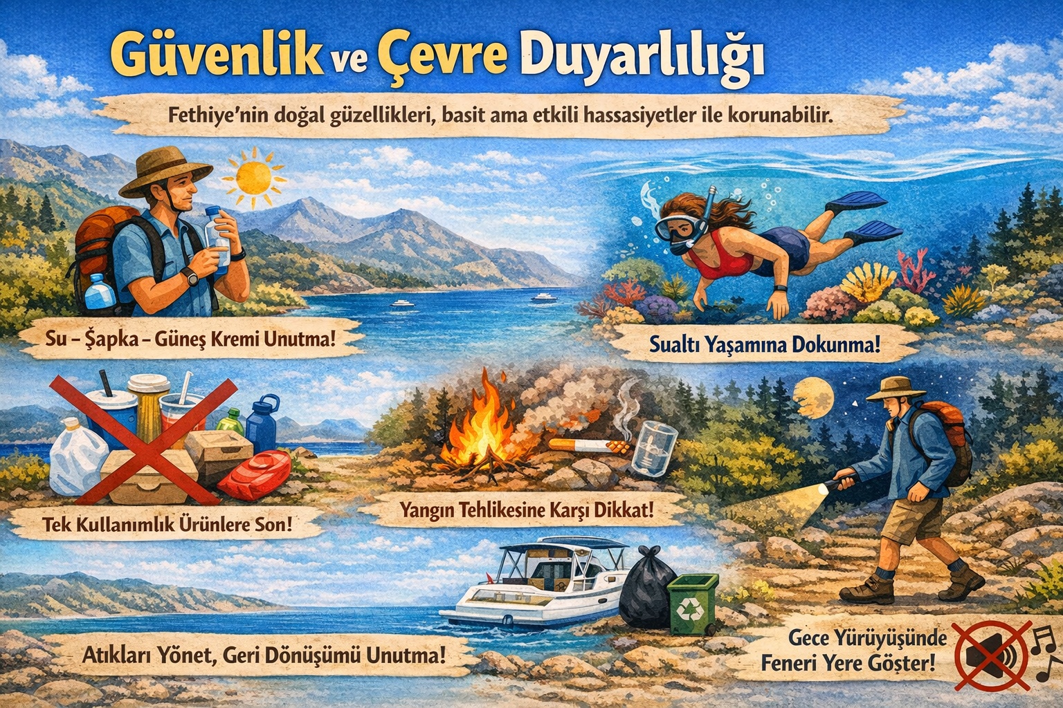 Fethiye’nin doğal güzellikleri, ziyaretçilerin basit ama etkili hassasiyetleriyle uzun yıllar korunabilir. Patikalar kayganlaştığında adımı yavaşlatmak, sıcak çarpmasına karşı su–şapka–güneş kremi üçlüsünü aksatmamak, günün keyfini güvenle sürdürmenin temelidir. Koylarda tek kullanımlık ürünleri azaltmak, iz bırakmamak ve ses seviyesini doğanın ritmine saygılı tutmak; su altı yaşamına yaklaşırken şnorkelle dahi dokunmamak, hassas ekosistemler için önemlidir. Yaz aylarında orman yangını riski artar; ateş, izmarit ve cam kırıkları gibi tetikleyicilere karşı sıfır tolerans şarttır. Tekne günlerinde atık yönetimi, karada ise geri dönüşüm kutularını kullanmak, küçük ama etkili bir kültür inşa eder. Gece yürüyüşlerinde fenerin yönünü yere ve patikaya tutmak, canlıları rahatsız etmemek için basit bir önlemdir. Sürdürülebilir tatil alışkanlıklarını destekleyen konaklama seçimleri, bu bilinci pekiştirir.