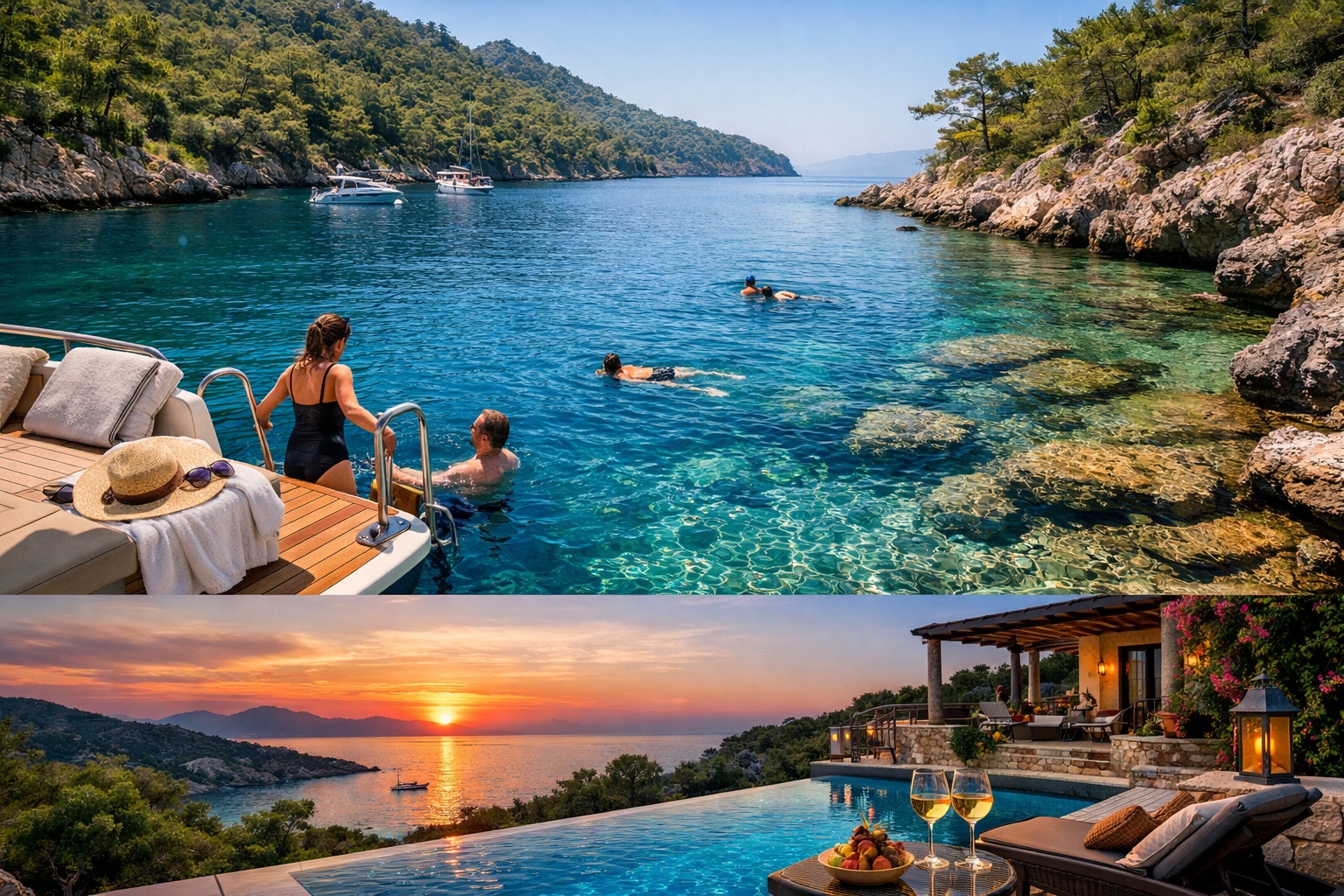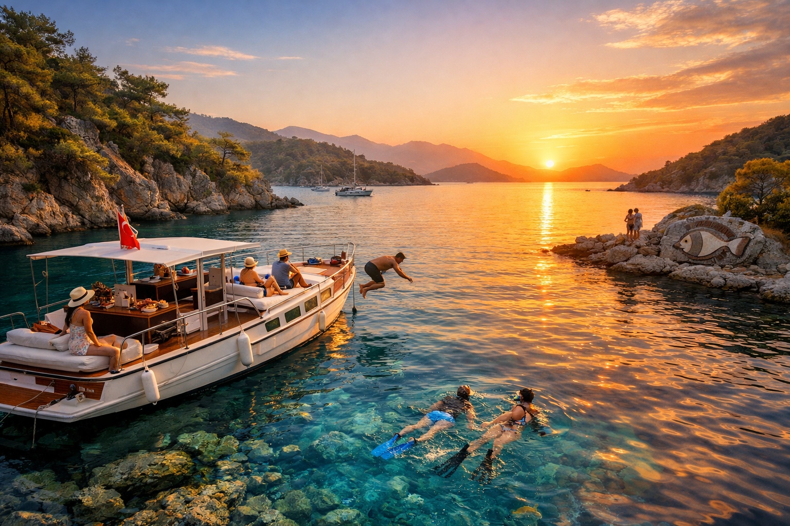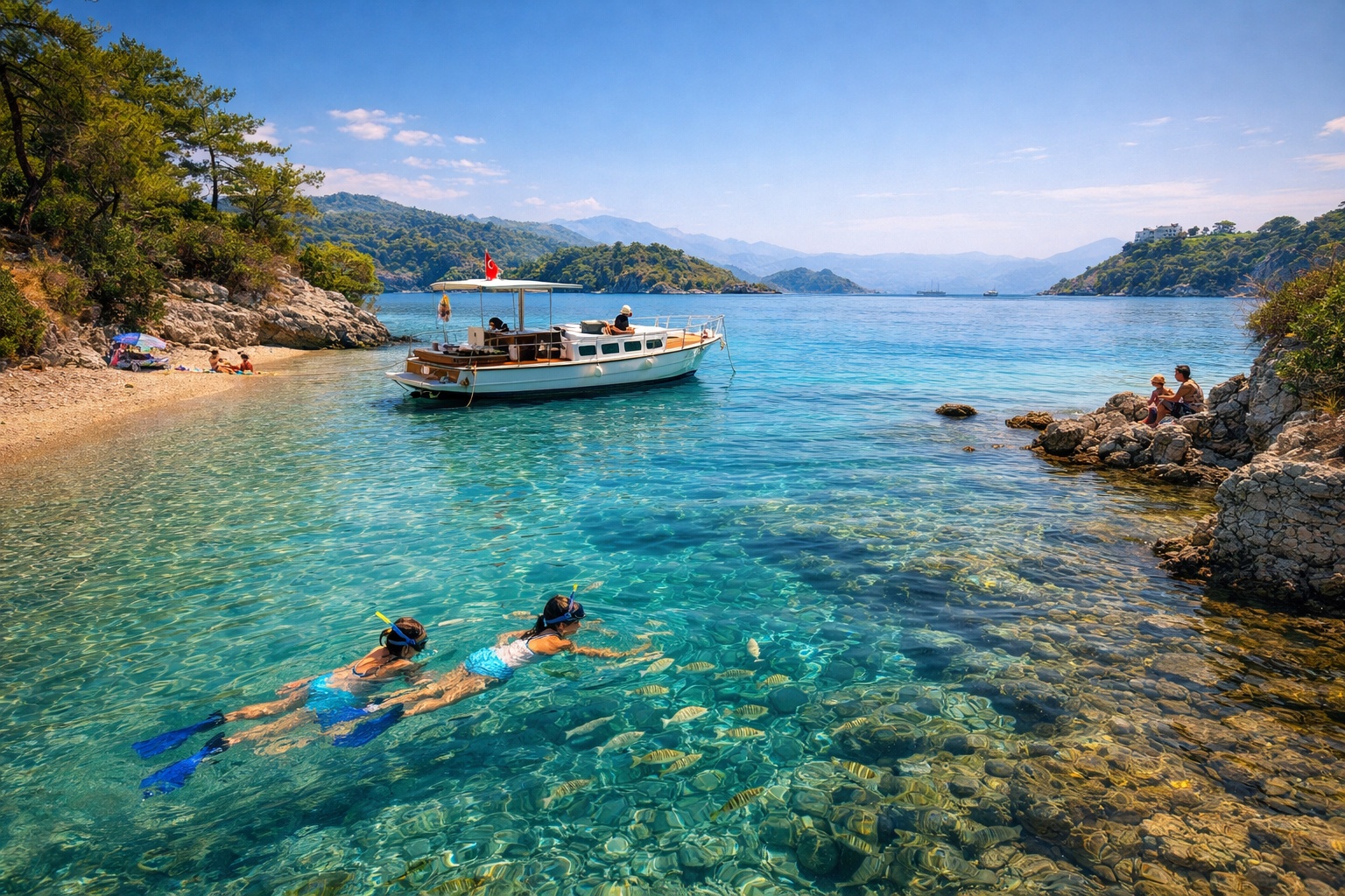 Fethiye tatilinde tekne turları, günün ritmini berrak koyların nabzına uydurmanın en keyifli yoludur ve Göcek çıkışlı 12 Adalar, bu deneyimin en popüler sahnesidir. Sabah erken saatlerde limandan ayrıldığınızda su, rüzgâr ve ışık en uyumlu hâlini alır; ilk demirde sessizlik neredeyse duyulabilir bir varlığa dönüşür. Yassıca’dan Bedri Rahmi Koyu’na uzanan rota, kısa yüzüşler ve uzun keyif molalarıyla akışı dengeler. Öğle saatlerinde suyun üstündeki pırıltı yoğunlaşır; maske ve şnorkelle kıyıdan biraz açılmak, adını “akvaryum”dan alan berraklığın nedenini gösterir. Özel tekne kiralayarak rotayı kişiselleştirmek kalabalıkları yönetmek ve kutlama planları yapmak için idealdir. Gün batımına yakın bir yüzeyde demir almak, gökyüzü turuncuya dönerken denizin rengine aynalık etkisi verir. Dönüşte merkeze yakın Kiralık Fethiye Villaları arasından seçim yapmak akşamı konforla kapatır.