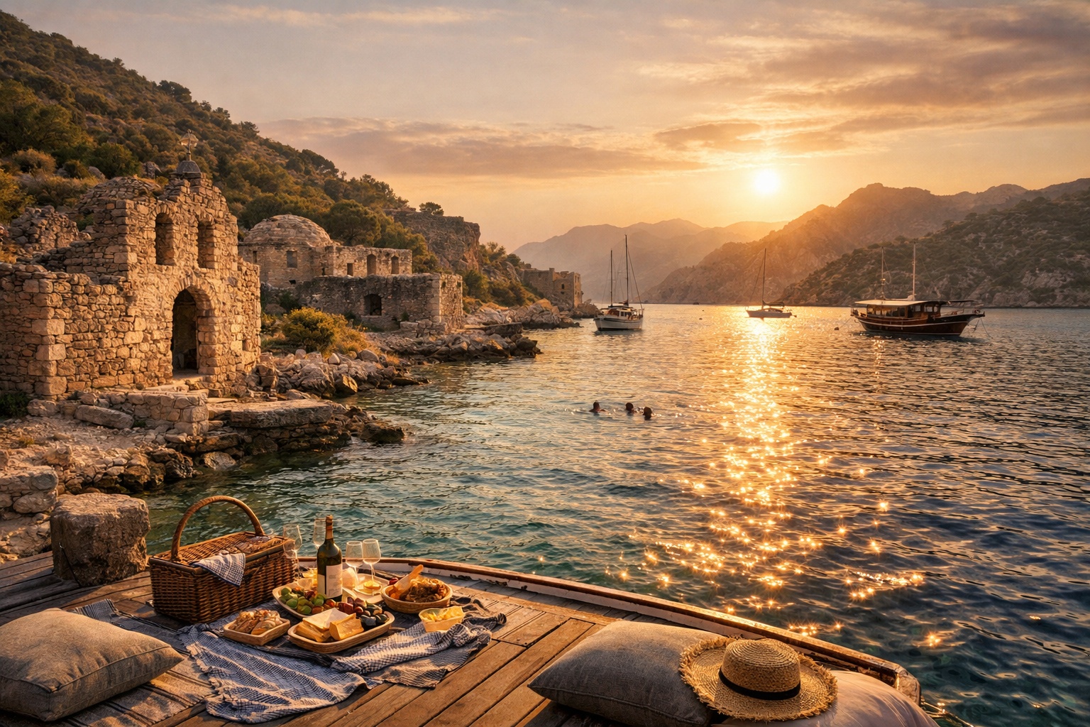 St. Nicholas (Gemile) Adası, tarih ve doğayı aynı gün içinde tadına vararak yaşamak isteyenler için kusursuz bir ara duraktır. Kıyıya çıktığınızda kısa bir patikayla ada üzerindeki erken dönem kilise kalıntılarına ulaşır, taş duvarların rüzgârla kurduğu asırlık sohbeti dinlersiniz. Tepelerden körfeze bakan bakış açısı, denize açılan mavi katmanları tablo gibi serer; tekne güvertelerindeki minik hareketler sessiz bir ritim oluşturur. Öğlen üzeri güneş sertleştiğinde gölgelik noktalarda kısa su molaları verip kıyıdan ilerlemek, günün akışını dengeler. Akşamüstü ışığı taşın rengini ısıtır, fotoğraflar daha anlatısal bir havaya bürünür. Adanın çevresi dalgasız günlerde şnorkel için elverişlidir; tabandaki kayalık formlar ve yosun kolonileri, su altına doku katar. Gün batımına yakın koydan ayrılıp karada sakin bir akşam planlamak, özellikle manzaraya bakan Balayı Villaları gibi seçeneklerde konaklıyorsanız, günü romantik bir finale taşır.