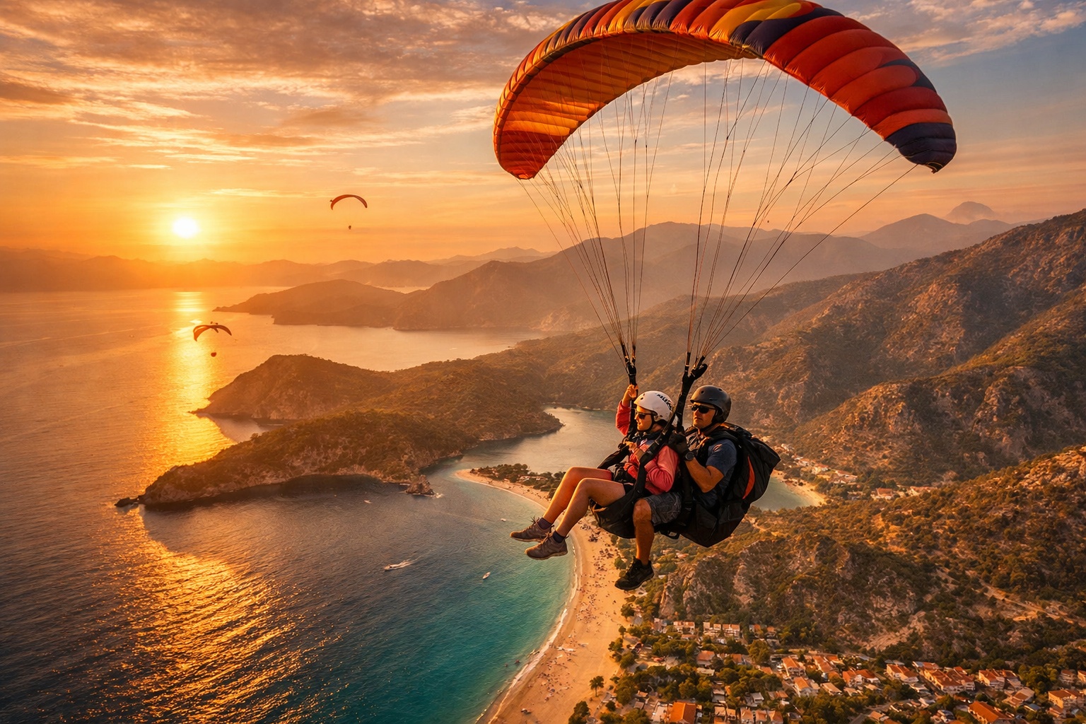 Babadağ, Fethiye’nin gökyüzüne açılan kapısıdır ve 1700–1960 metre pistlerinden yapılan tandem uçuşlar, bölgenin simgesi hâline gelmiştir. Profesyonel pilotla birlikte kalkışa hazırlanırken rüzgârın yönü ve şiddeti dikkatle takip edilir; güvenlik briefingi, deneyimi rahatlatan ilk adımdır. Koşup kanadın şişmesini hissettiğiniz anda bedeniniz yerden ayrılır; birkaç saniye içinde sahil şeridi, lagün ve dağların katmanları kuşbakışı bir tabloya dönüşür. “Golden hour” uçuşları, renkleri sinematik bir tona boyar; denizin üstünde açılan kadrajda gölgeler uzar, manzara şiirleşir. İniş alanı Belcekız sahilinde kumların yumuşak karşılamasıyla deneyim tamamlanır. İlk kez uçacaklar için yükseklik korkusu, havalanır havalanmaz yerini huzura bırakır; süzülmenin ritmi meditatiftir. Uçuş sonrası günü hafif bir deniz molası ve akşamı manzaraya karşı uzun bir yemekle kapatmak, adrenalinle romantizmi aynı günde buluşturur.