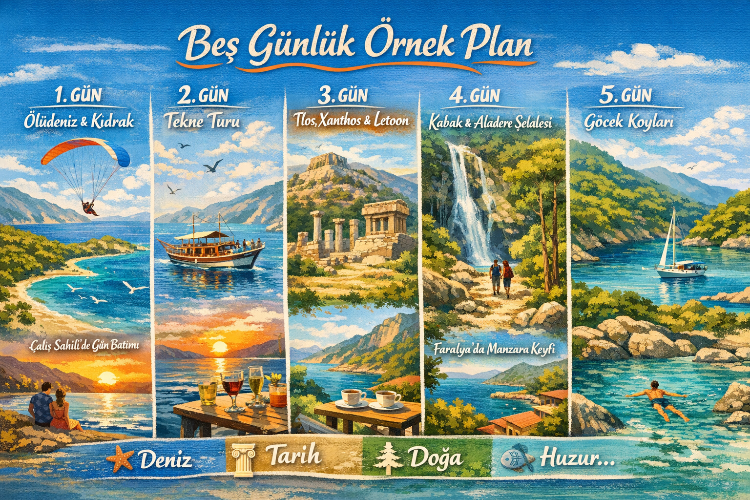 Beş gün, Fethiye’nin doğa–tarih–deniz üçlüsünü sindire sindire yaşamak için ideal bir uzunluktur. İlk iki gün deniz odaklı ilerleyip Ölüdeniz, Kidrak ve bir tekne turu arasında denge kurabilirsiniz; gün batımlarını Çalış’ta karşılamak, akşam programını hafif tutar. Üçüncü gün Tlos–Letoon–Xanthos üçlüsüne ayrıldığında, Likya’nın katmanlı hikâyesi taşlar arasında belirir; sabah erken çıkış ve su, gölgeli molalarla desteklenmelidir. Dördüncü gün Kabak yürüyüşü ve Aladere Şelaleleri’yle serinleyen rota, akşamüstü Faralya teraslarında kahveyle elde edilen manzara eşliğinde tamamlanır. Beşinci gün Göcek koylarında daha sakin bir rota seçip, Bedri Rahmi Koyu ya da Akvaryum çevresinde uzun yüzüşlerle zihni boşaltabilirsiniz. Konaklamayı arada evde akşam yemeği yapmaya elverişli, teraslı bir villayla kurgulamak; bütçe, mahremiyet ve esneklik üçlüsünü dengeler. Bunun için Deniz Manzaralı Villalar ya da Jakuzili Villalar kategorileri ideal.