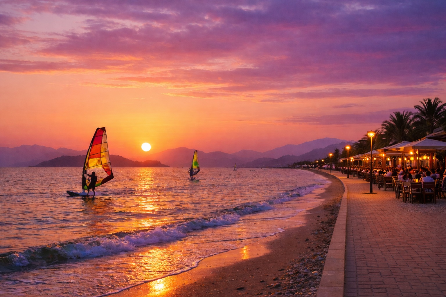 Çalış Sahili, Fethiye’nin “gün batımı tiyatrosu” gibidir; ufukta güneş yavaşça inerken gökyüzü turuncudan menekşeye doğru sürreal bir palete açılır. Rüzgâr sörfçülerinin su üstündeki salınımı manzaraya hareket katar; sahil boyunca yürürken dalga kırıntıları ayak bileklerinize usulca vurur. Akşamüstü saatlerinde sıcaklık azalır, restoranların ışıkları yanar ve deniz ürünleri kokusu rüzgâra karışır. Fotoğraf için tripod gerekmez; sabit bir kadrajla dahi su yüzeyindeki pırıltılar yakalanır. Aileler için uzun yürüyüş sonrası rahat bir yemek, çiftler içinse gün batımını izlerken paylaşılan sessizlik, Çalış’ı vazgeçilmez kılar. Yaz akşamlarında hafif meltem, günü ağırlaştırmadan uzatır; kışın ılıman havalarda ise sahil, sessiz ve dingin bir yürüyüş rotasına dönüşür. Yemeğin ardından konaklamaya yakın olmak planı rahatlatır; bu sebeple merkez erişimi kolay Kiralık Fethiye Villaları arasından seçim yapmak, akşam programını akışkan tutar.