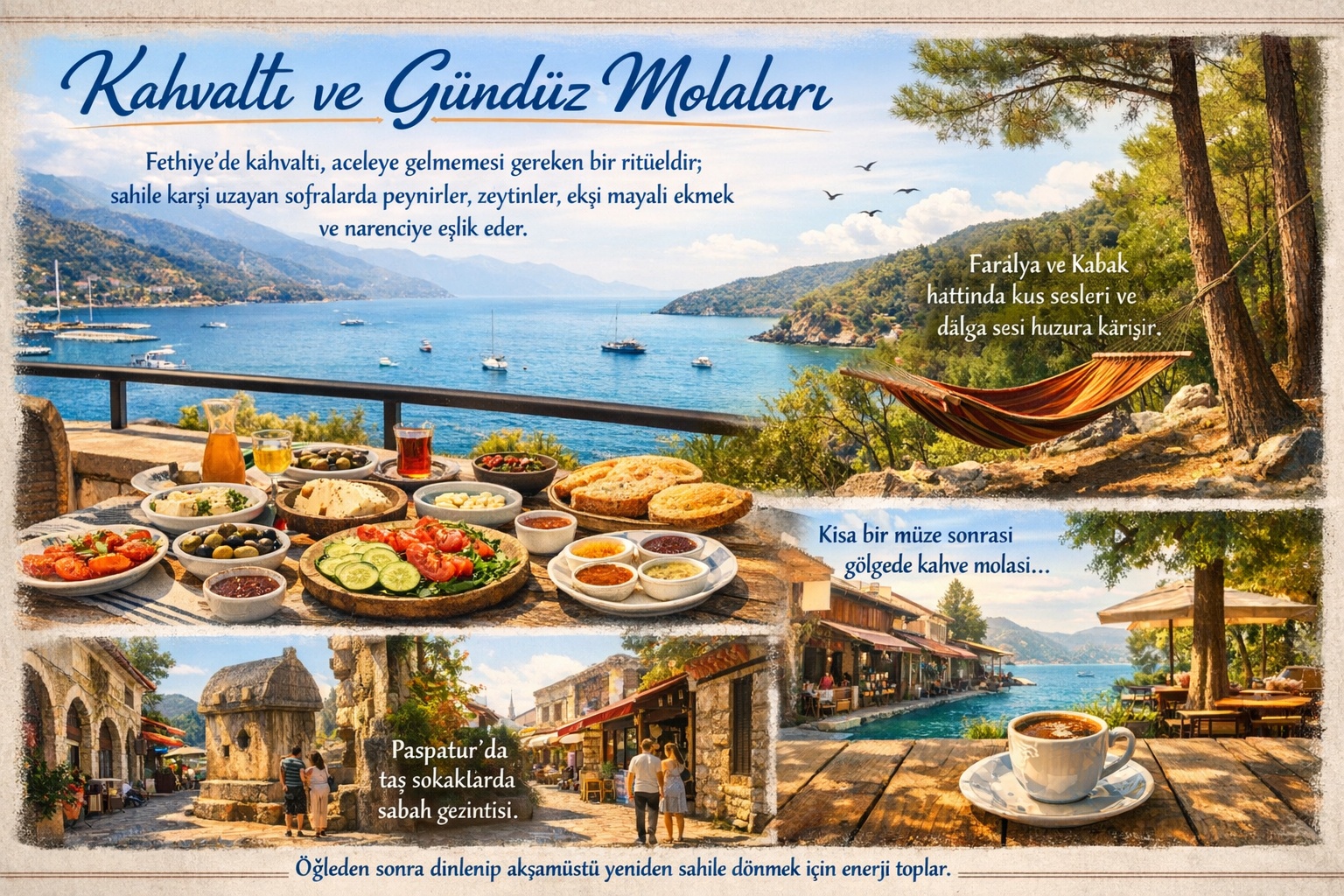 Fethiye’de kahvaltı, aceleye gelmemesi gereken bir ritüeldir; sahile bakan teraslarda uzayan sofralar, yerel peynirler ve zeytinlerin yanına taze domates, ekşi mayalı ekmek ve narenciye eşlik eder. Faralya ve Kabak hattında çamların gölgesine karışan kuş sesleri, sabahı bir anda dinginleştirir; dalga sesi arka planda yalnızca ritim tutar. Şehir içinde Paspatur çevresinde günün erken saatlerinde dolaşmak, kalabalık yükselmeden taş dokuyu izleme şansı verir. Kahvaltıyı ağır ağır uzatıp öğle sıcağına girmeden kısa bir müze ya da çarşı ziyareti eklemek, günün geri kalanını hafifletir. Öğleden sonra evde ya da gölgeli bir kafede kahve molası, akşamüstü yeniden sahile dönmek için enerji toplar. Uzun konaklamalarda geniş mutfaklı bir villa, sabah ritüelini özelleştirmenin en keyifli yoludur; manzaraya karşı çay demlenirken günü planlamak, tatili ev konforuna yaslar. Bu deneyim için teras alanı geniş, konumu pratik Kiralık Fethiye Villaları doğru zemini sağlar.