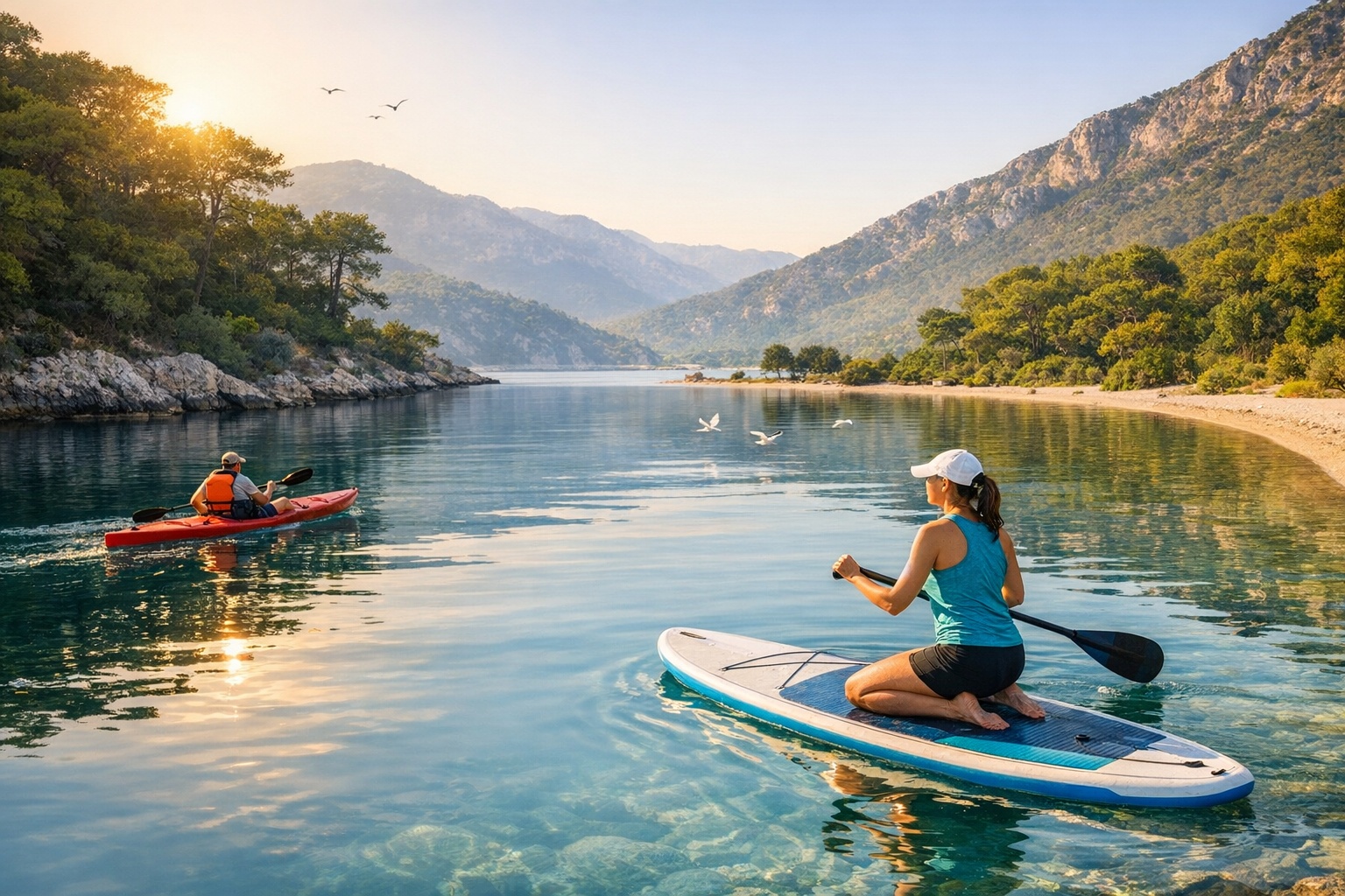 Ölüdeniz’in lagünü, su sporlarına yeni başlayanlar için neredeyse laboratuvar koşullarında güvenli ve öngörülebilir bir ortam sunar. Sabah erken saatlerde rüzgârın henüz uyanmadığı dilimde su yüzeyi cam gibi sakinleşir; kano küreği ya da SUP küreğinin her vuruşu, gövdeden çıkan nefesin ritmiyle eşleşerek bir meditasyona dönüşür. Lagünün kıvrımlı kıyı çizgisini, kıyıya fazla yaklaşmadan ve kuş alanlarını rahatsız etmeden takip etmek doğayla uyum içinde hareket etmenin en keyifli yoludur. Öğleye yaklaşırken güneş dikleşir; kısa gölgelenme molaları ve su tüketimi performansı korur. Suya düşme ihtimali olan anlarda panik yerine kontrollü bir diz çöküşle dengeyi yeniden bulmak, yeni başlayanlara özgü “ilk öğrenme” eşiğini hızla aşır. Gün sonunda, kaslarda tatlı bir yorgunluk ve zihinde berrak bir dinginlik kalır. Bu ritmi akşam da sürdürmek isterseniz, lagüne kısa sürüş mesafesindeki Kiralık Fethiye Villaları arasından konum avantajı olan bir evi seçmek günü pürüzsüz kapatır.
