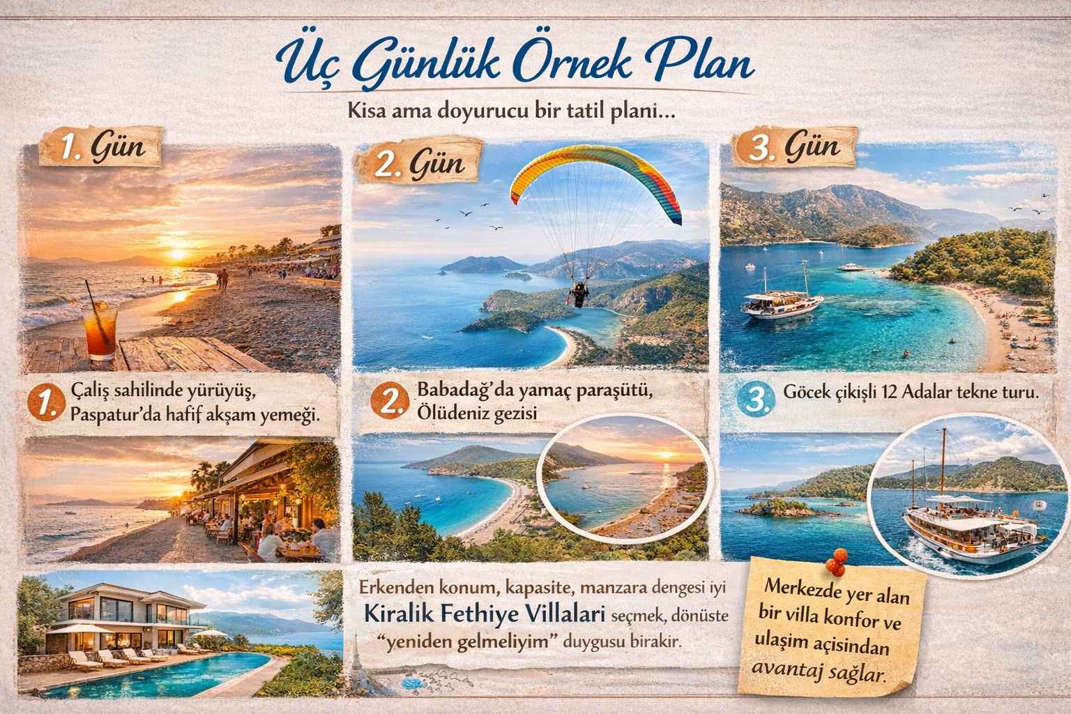 Üç gün, doğru kurgulandığında Fethiye’yi tanıştıran, temposu dengeli bir kartvizite dönüşebilir. İlk gün merkeze yerleşip Çalış sahilinde uzun bir yürüyüşle güneşi indirmek, Paspatur’da hafif bir akşam yemeğiyle ritmi tecrübe etmek iyi bir açılıştır. İkinci gün sabah Babadağ’dan tandem uçuşla gökyüzüne karışıp, öğleden sonra Ölüdeniz ve Kumburnu’nda denizin tonlarına teslim olmak; akşamüzeri gün batımını Belcekız’da izlemek, “Fethiye’nin özeti”ni tek güne sığdırır. Üçüncü gün Göcek çıkışlı 12 Adalar’da Yassıca ve Bedri Rahmi Koyu gibi duraklarda yüzüp, tekne güvertesinde kitap ve kısa kestirmelerle zihin dinlendirilir. Konaklamayı merkez ulaşımı kolay bir adreste seçmek, geç saatlerde yorgun dönüldüğünde planı yormaz; bu nedenle Kiralık Fethiye Villaları içinden konum–kapasite–manzara dengesi iyi bir evi erken almak avantaj sağlar. Kısa ama dolu dolu bir kaçamak, dönüşte “yeniden gelmeliyim” duygusunu bırakır.