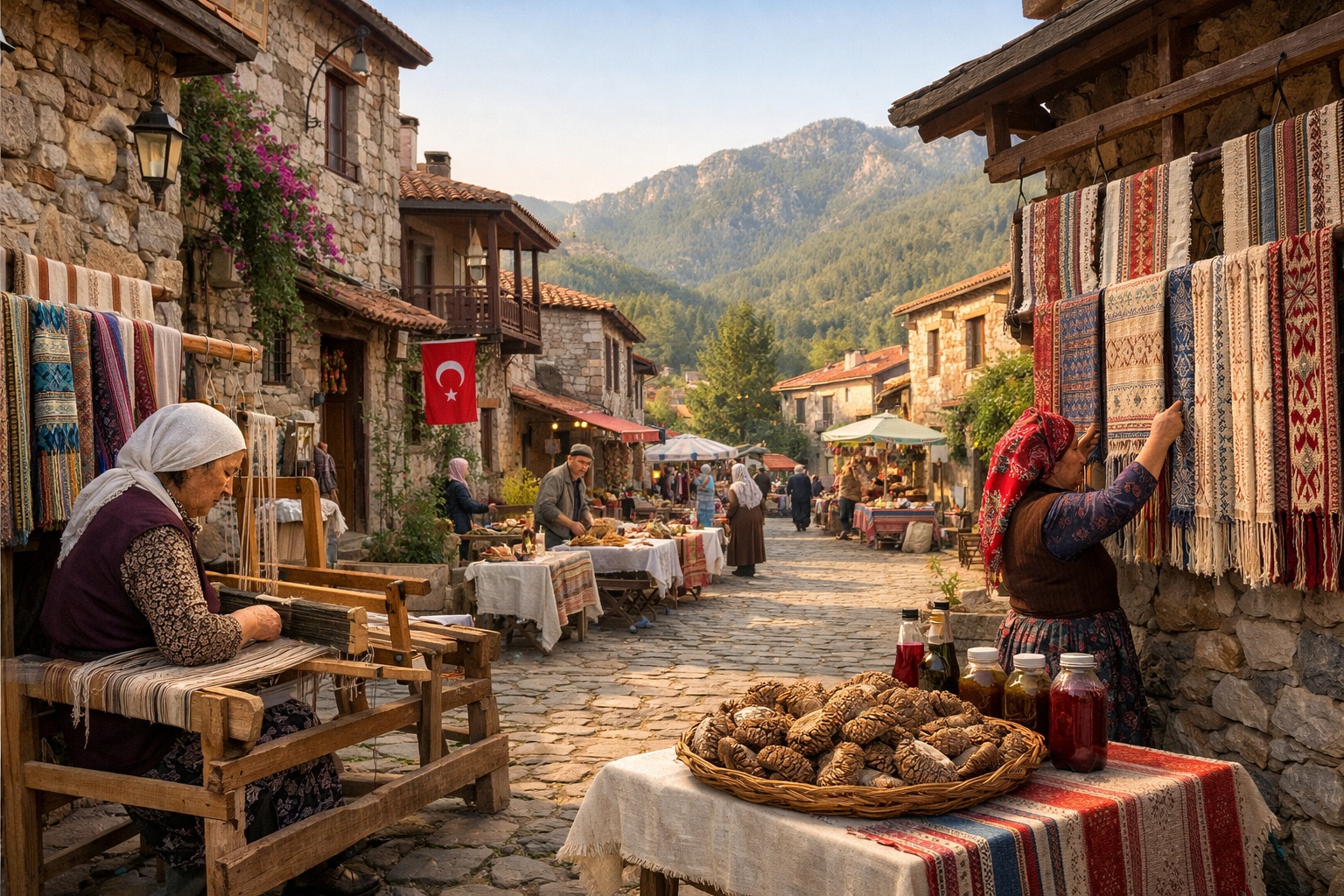 Üzümlü, taş evli sokakları ve el dokuması “dastar” tezgâhlarıyla Fethiye’nin sahil ritminden ayrışan pastoral yüzünü temsil eder. Sabah saatlerinde köy meydanında dolaşırken taş duvarların arasında yankılanan ayak sesleri ve uzaktan gelen tezgâh sesleri, zamansız bir fon yaratır. Doğru sezonda kuzugöbeği mantarı şenliği köye canlı bir kalp atışı kazandırır; yerel üreticilerin tezgâhlarında doğadan gelen lezzetlerin hikâyelerini dinlemek, kültürel bağ kurmanın en samimi yoludur. Dastar dokumalarının incelikli motifleri, Anadolu’nun farklı dönemlerinin sessiz anlatıcıları gibidir; küçük bir parça, hem estetik hem hatıra değeri taşır. Köy çevresindeki yürüyüşler, sahilin tuzlu kokusundan tamamen farklı bir çam–toprak karışımı taşır burna. Günün sonunda sahile dönmek yerine, orman–dağ bakışını koruyan bir terasta akşamı uzatmak isterseniz, doğa ile mahremiyeti birleştiren Muhafazakâr Villalar huzurlu bir kapanış sağlar.