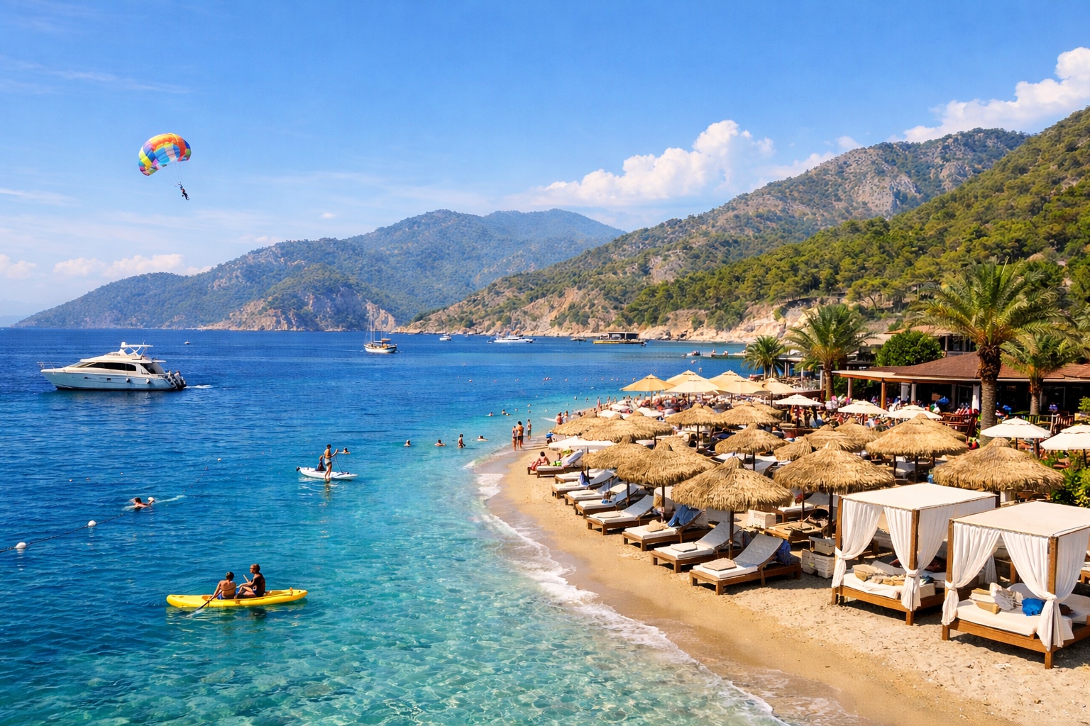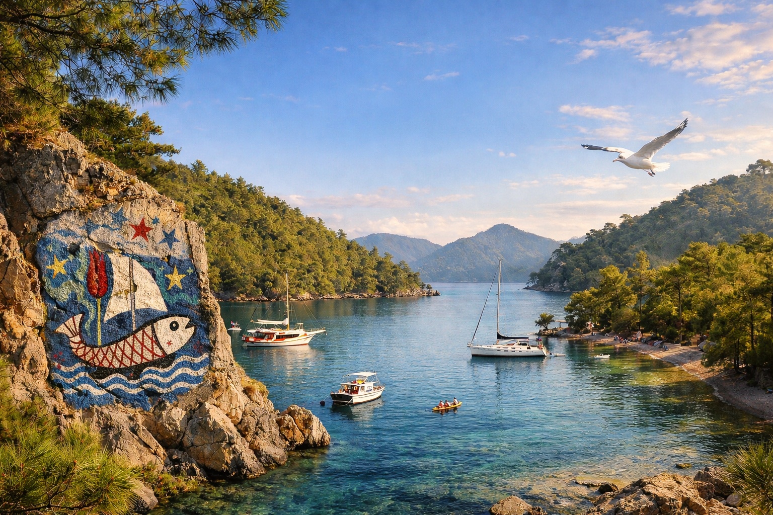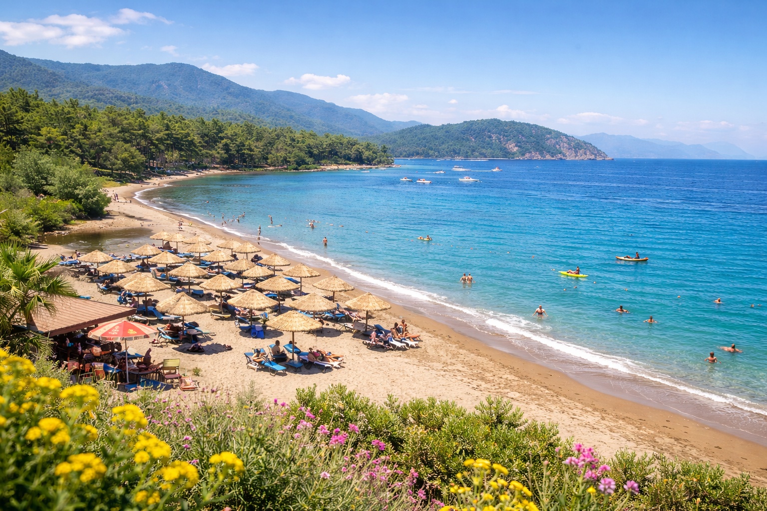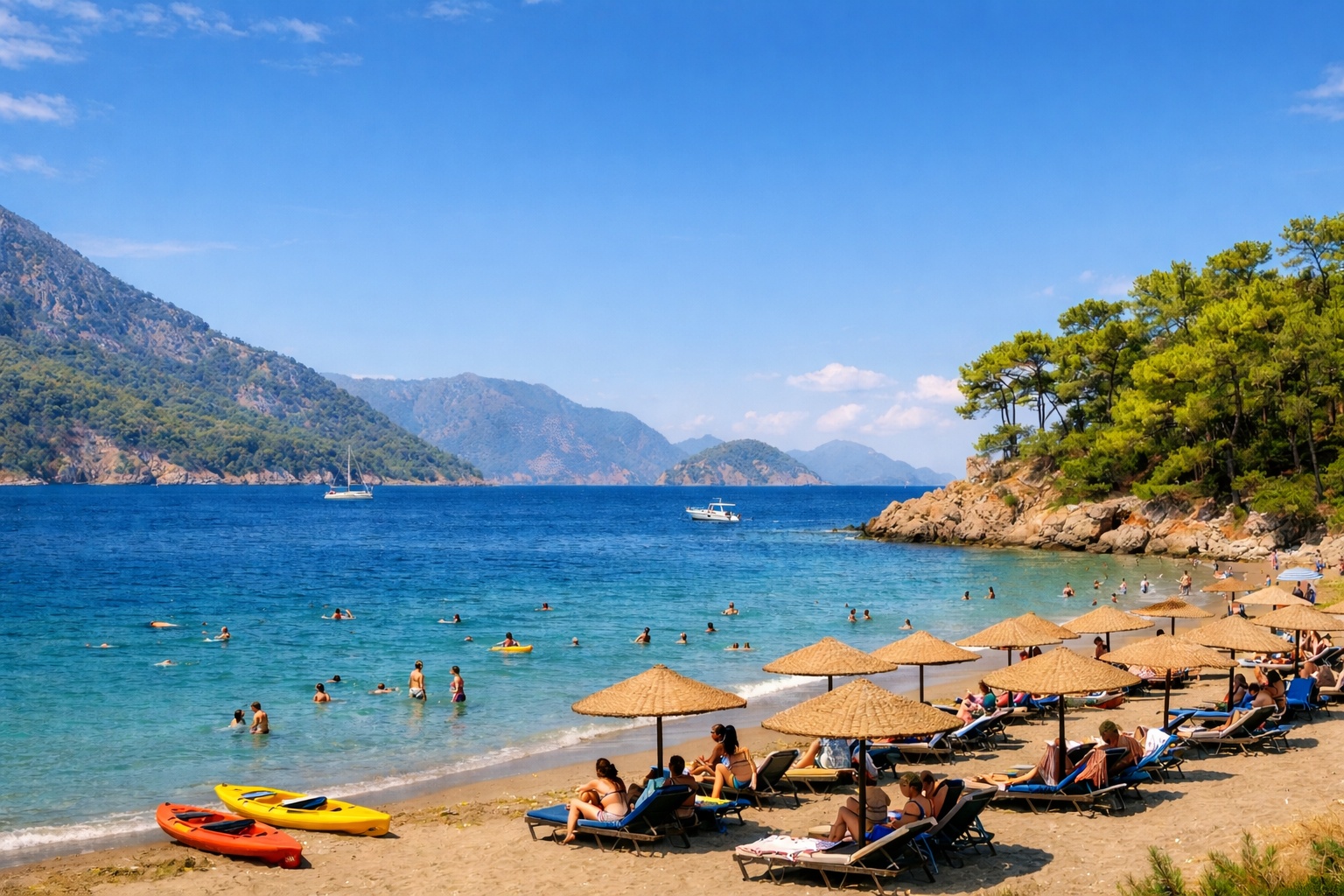 Ölüdeniz’e çok yakın konumda, daha doğal ve görece daha sakin bir alternatif; çam ormanı dokusu sayesinde gölge ve serinlik hissi yüksektir. Kalabalık yönetimi açısından daha “kontrollü” bir deneyim sunar; Ölüdeniz ile aynı gün içinde “B planı” olarak da çalışır.