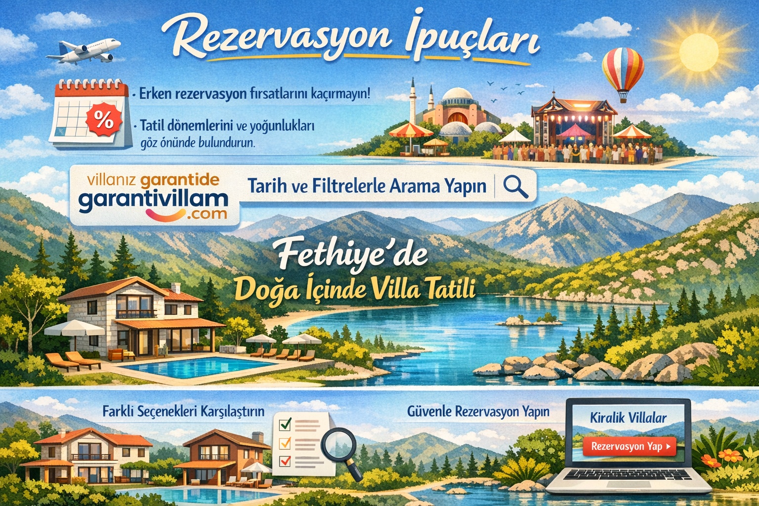 Erken rezervasyon dönemlerini takip edin ve tarihlere esneklik tanıyın. Bölgelere özgü doluluk artışlarını (resmi tatil, bayram, festival) göz önünde bulundurun. Müsaitliği ve toplam maliyeti net görmek için Garanti Villam üzerinde tarih/sayfa filtreleriyle arama yapın. Fethiye’de doğa içi konaklama odağında doğru bölge ve konsepti seçtiğinizde, tatil kalitesi belirgin şekilde artar. Seçenekleri karşılaştırmak ve güvenle rezervasyon yapmak için Kiralık Villalar sayfasını ziyaret ederek başlangıç yapabilirsiniz.
