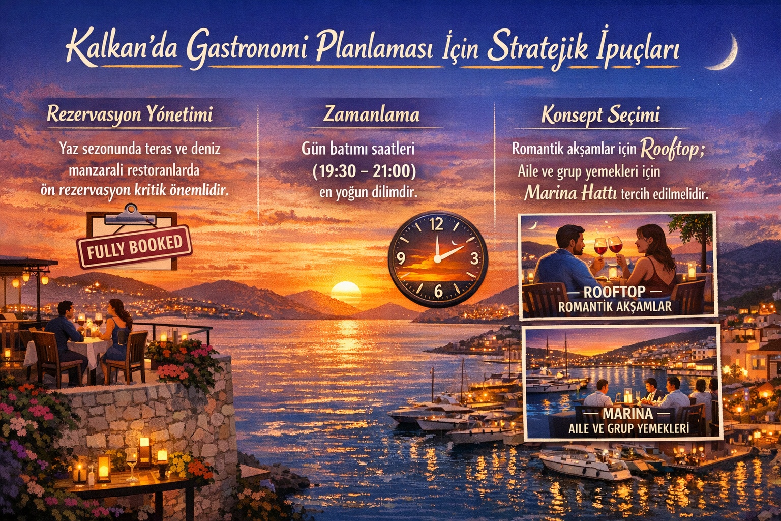 Kalkan, sınırlı bir coğrafyada yüksek yoğunluklu gastronomik değer sunan nadir destinasyonlardan biridir. Teras fine-dining, taze deniz ürünleri ve butik restoran anlayışı; bölgeyi yalnızca tatil değil, lezzet odaklı bir destinasyon haline getirmektedir.