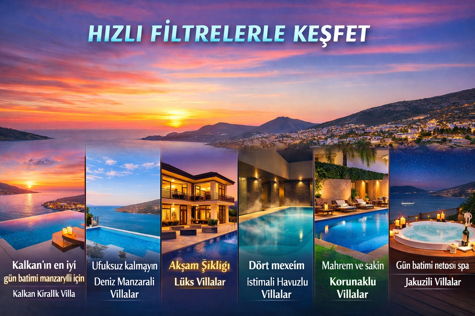 Kalkan’da akşam ışıklarını en iyi yakalayan villalar; batı/güneybatı cephe, yüksek kot, geniş teras, denizle birleşen havuz aynası ve sıcak teras aydınlatmalarını bir araya getirir. İhtiyaçlarınıza göre deniz manzarası, mahremiyet, spa ve mevsim konforu gibi filtrelerle seçim yaparak her akşamı “özel bir gün batımı ritüeline” çevirebilirsiniz. Başlamak için: Kalkan kiralık villa ve ilgili kategoriler üzerinden hızlıca filtreleyin.