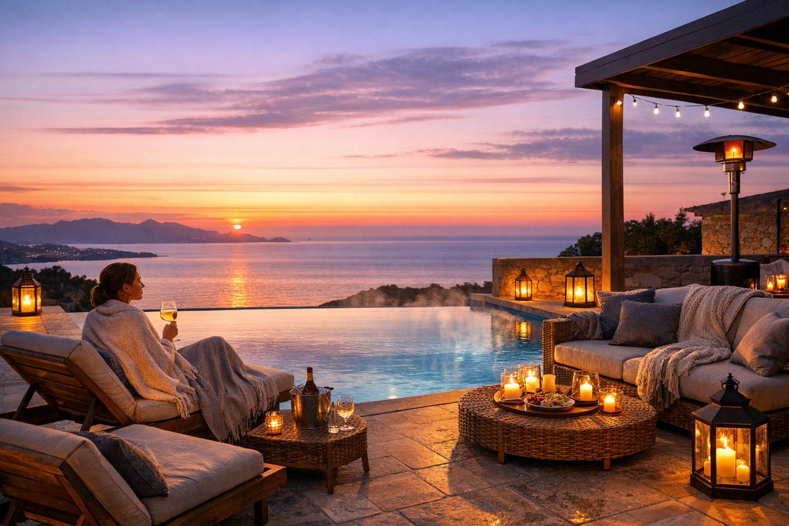 - • Saat seçimi: Golden hour başlangıcından 30–40 dk önce terasta olun; gün batımı sonrası “blue hour”da havuz ve teras ışıklarını açın.