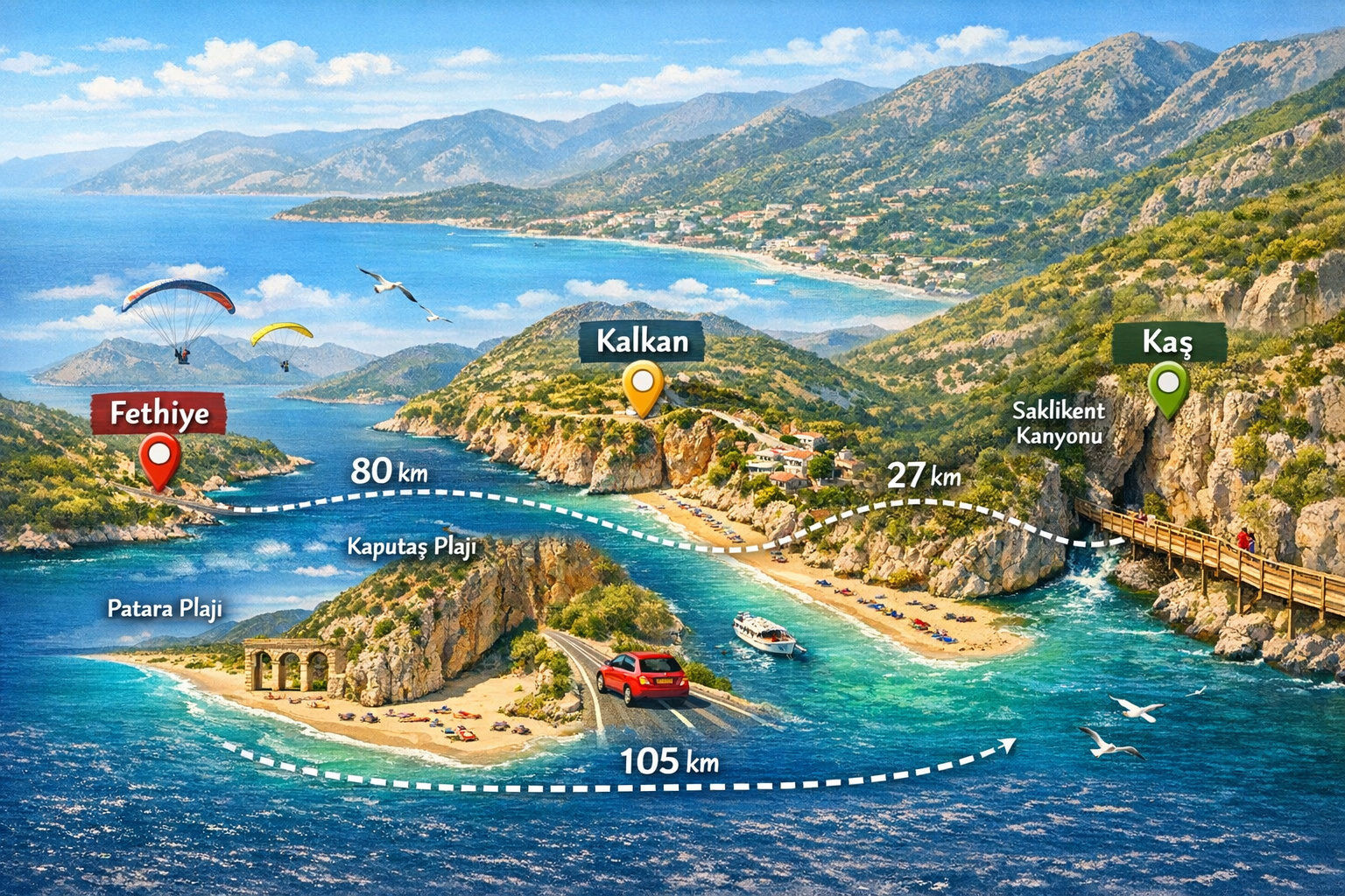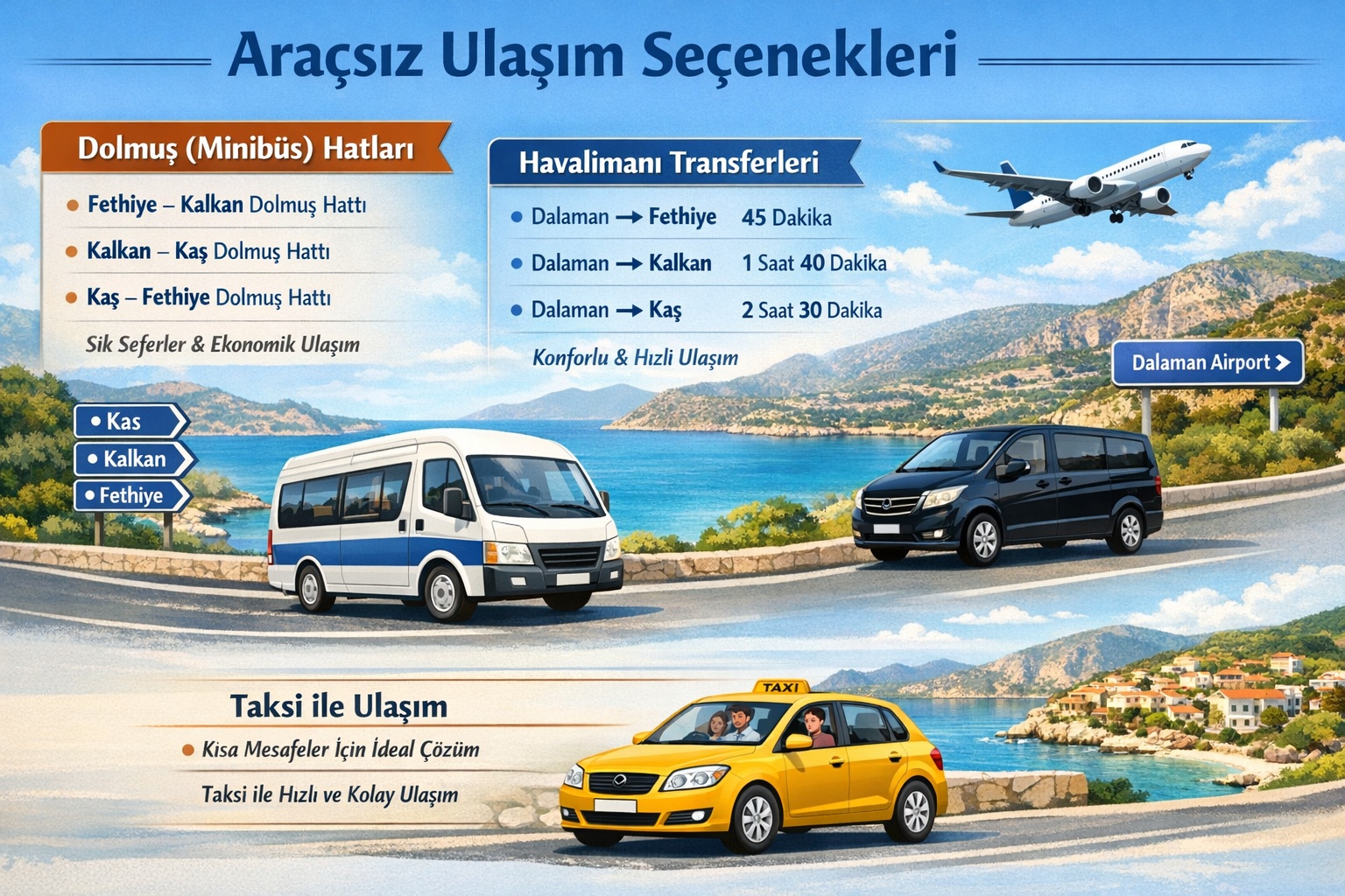 Bu rehberde Kaş, Kalkan ve Fethiye arasındaki ulaşım seçeneklerini detaylı şekilde inceleyebilir; araçlı ve araçsız seyahat alternatiflerini, ortalama mesafeleri, yol sürelerini ve önerilen rota planlarını kapsamlı bir şekilde öğrenebilirsiniz.