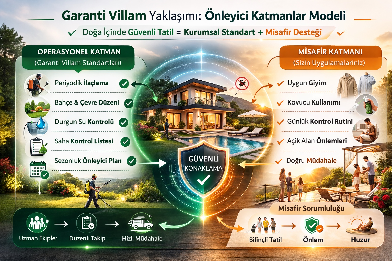 Garanti Villam olarak; villalarda periyodik ilaçlama, çevre düzeni ve saha kontrol yaklaşımını merkeze alırken, misafir tarafında uygulanabilir korunma adımlarını şeffaf şekilde paylaşırız. Böylece tatil; yalnızca bir konaklama değil, kurumsal standardı olan güvenli ve planlı bir deneyim haline gelir.
