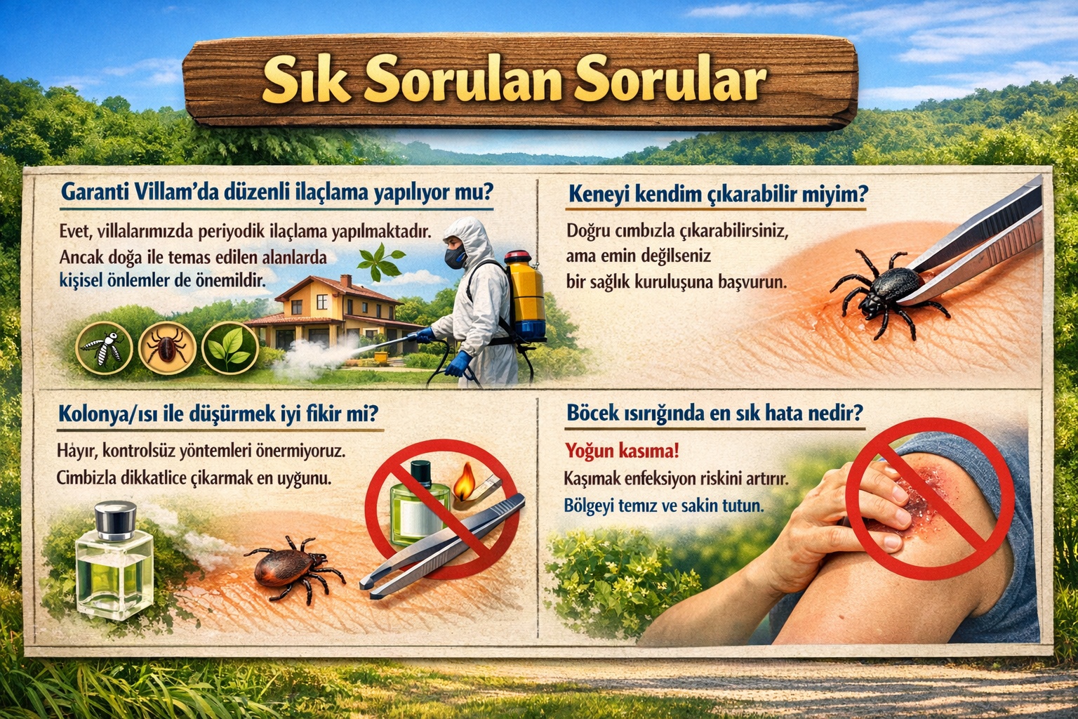 Garanti Villam standardı, riskleri saklamak yerine yönetir: Doğa ile temas içeren her konaklama modelinde çevresel değişkenler bulunur. Bu nedenle misafire doğru bilgilendirme yapılarak, kişisel önlemlerle operasyonel önlemler aynı çerçevede sunulur. Sonuç: Sürprizleri azaltan, beklentiyi doğru yöneten ve memnuniyeti artıran bir hizmet kurgusu.