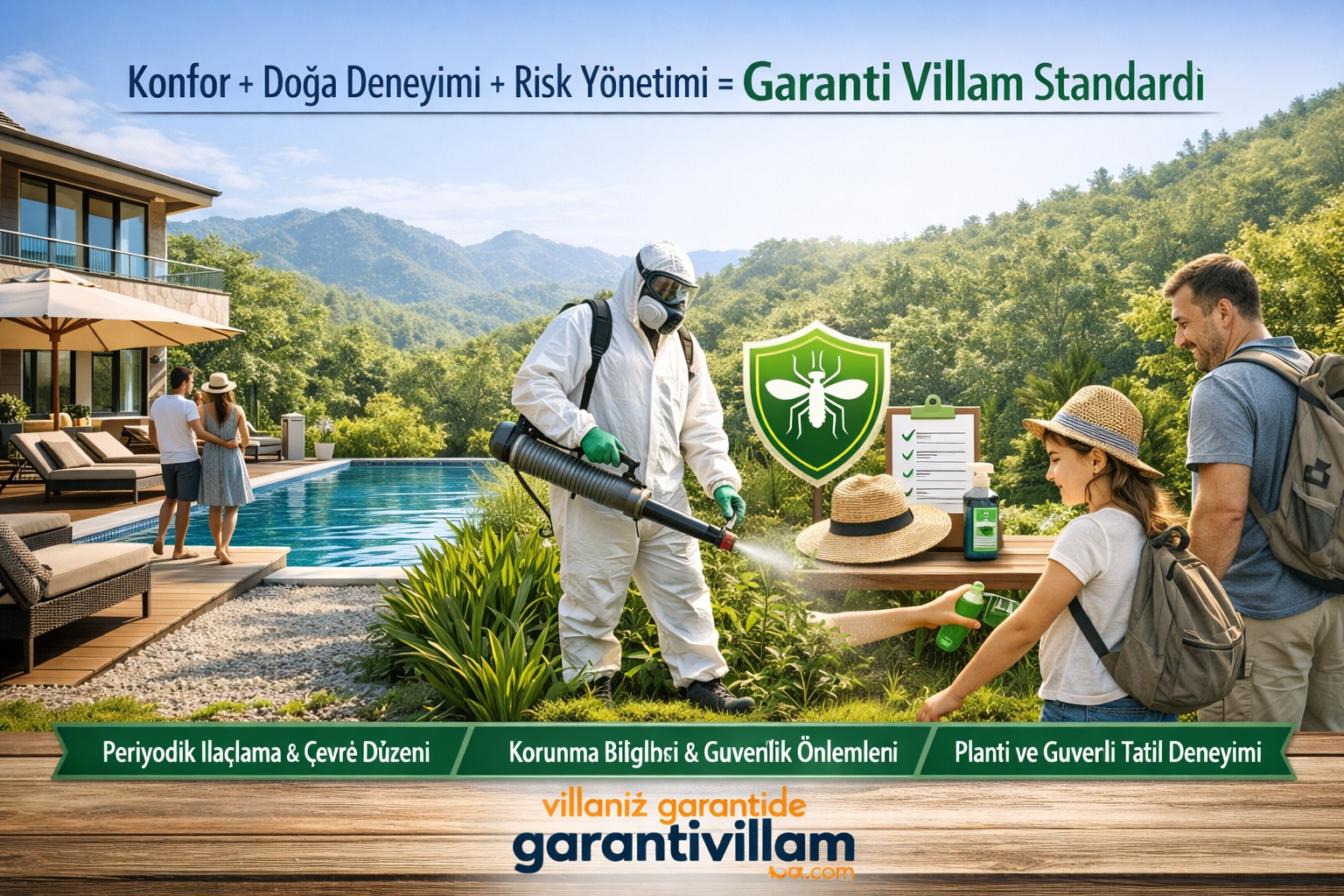 Garanti Villam portföy yönetimi perspektifinde, uygun saha koşullarında periyodik ilaçlama ve çevre yönetimi uygulamaları; misafir memnuniyeti ve hijyen standardının önemli bir parçasıdır. Bununla birlikte doğa ile temasın olduğu tüm destinasyonlarda çevresel değişkenler bulunduğundan, kişisel önlemler de sürecin ayrılmaz bileşenidir.