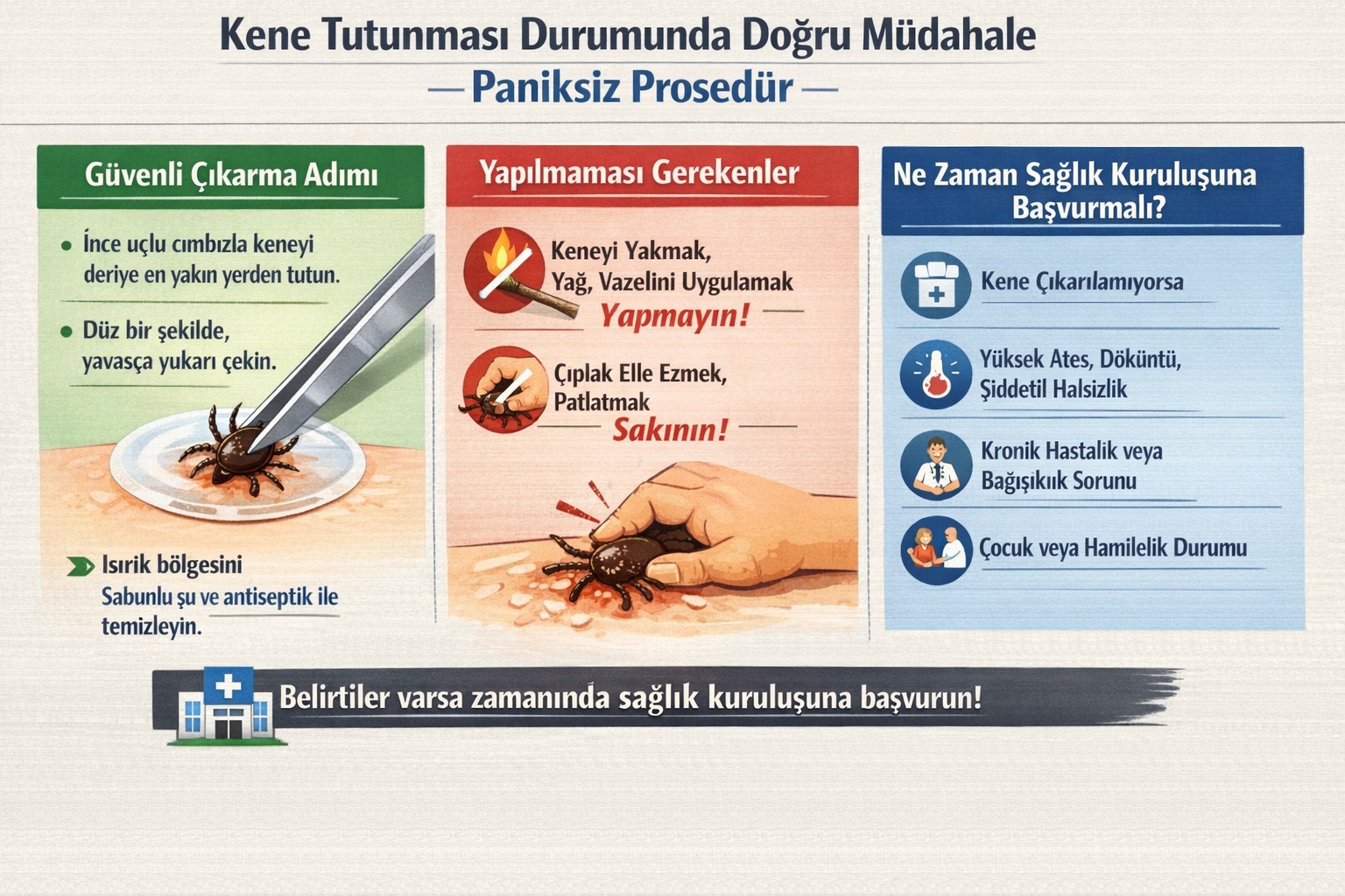 Kene ile karşılaşıldığında amaç: Keneyi güvenli şekilde uzaklaştırmak + bölgeyi temizlemek + takip etmek.