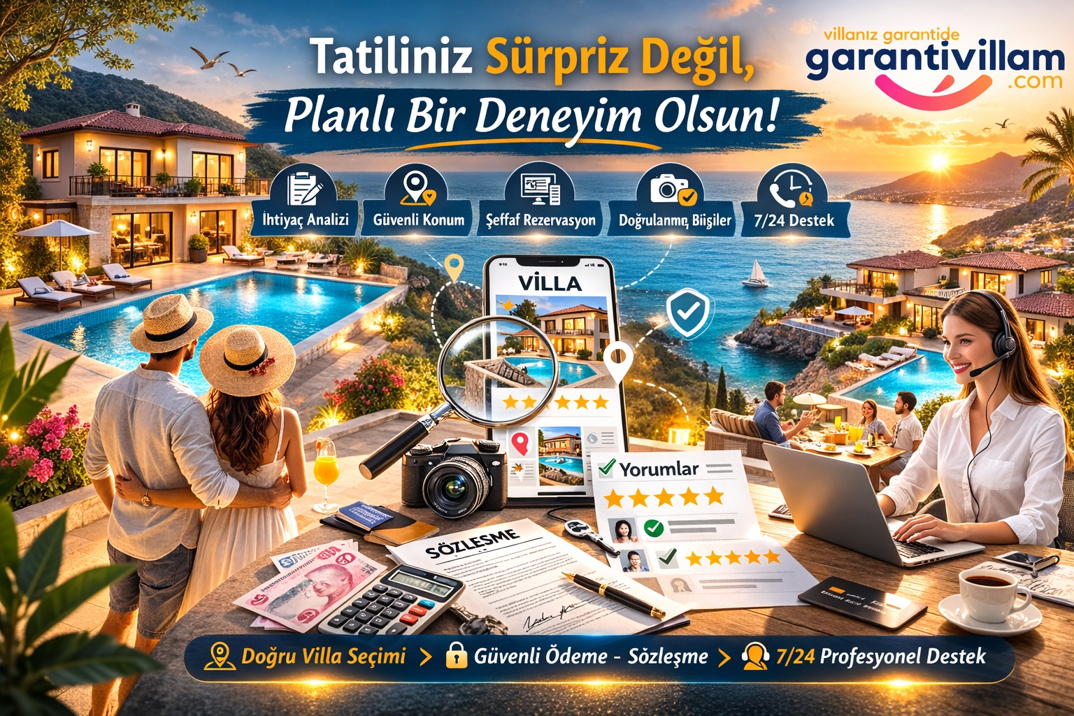 Sonuç olarak, Türkiye’de villa kiralarken ihtiyaç analizi, villa konumu ve güvenliği, rezervasyon sürecinin şeffaflığı, fotoğraf–yorum doğrulaması, fiyat ve ödeme koşullarının netliği ile yönetim ve destek hizmetlerinin sürekliliği gibi kriterleri birlikte değerlendirmeniz; tatil deneyiminizi risklerden arındırarak daha öngörülebilir ve memnuniyet odaklı hale getirir. Bu çerçevede Garanti Villam rezervasyon ile; uygun villa seçimini segment bazlı ihtiyaçlarınıza göre yapılandırabilir, ödeme–sözleşme adımlarını kontrollü ilerletebilir ve konaklama öncesi/konaklama süreci boyunca operasyonel destek alarak tatilinizi “sürpriz” değil, planlı bir deneyim olarak yönetebilirsiniz. Böylece doğru seçim, yalnızca konforu artırmakla kalmaz; aynı zamanda tatilinizin bütününde güven, gizlilik ve kalite standardını güçlendirir.