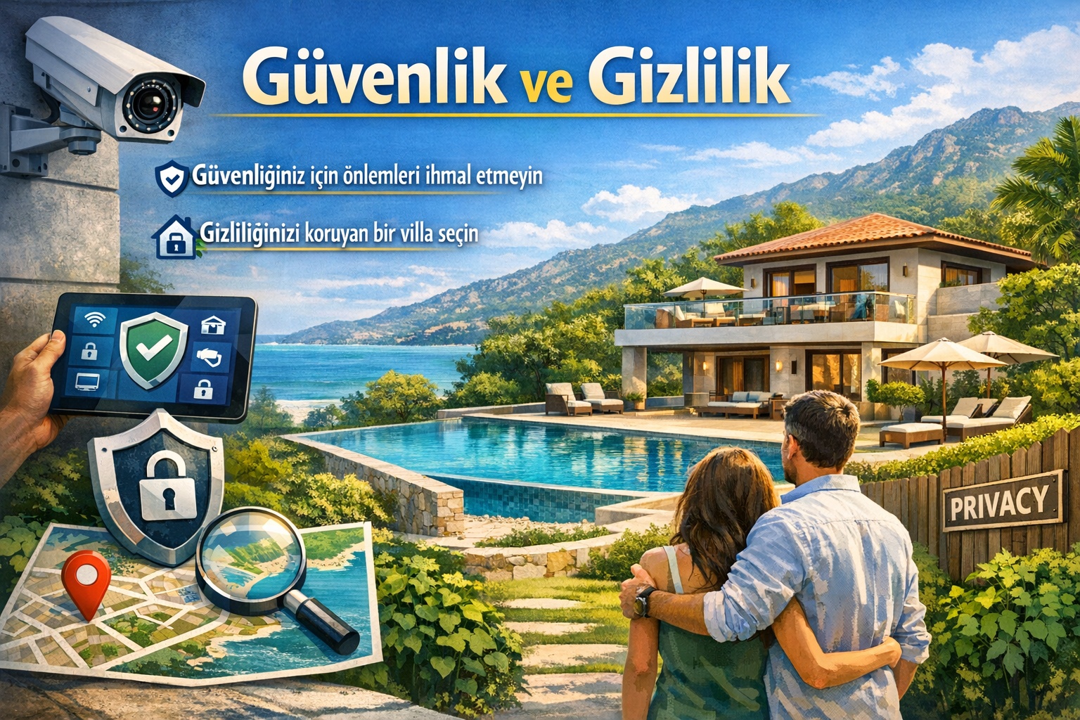 Tatilin tadını çıkarırken güvenliğinizi de sağlamak önemlidir. Villa kiralarken, güvenlik önlemleri hakkında bilgi almak ve konaklayacağınız bölgenin genel güvenlik durumunu araştırmak önemlidir. Ayrıca, size yeterli gizlilik sağlayacak bir villa seçmeye özen gösterin.