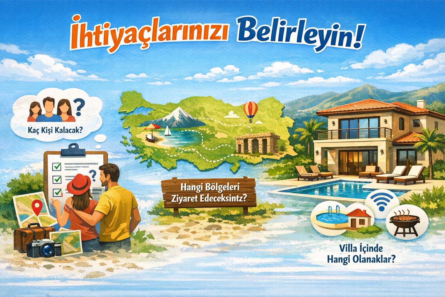 Öncelikle, tatil planınız ve konaklama süresine uygun olarak ihtiyaçlarınızı net bir şekilde belirlemeniz gerekmektedir. Kaç kişi kalacak, hangi bölgeleri ziyaret etmek istiyorsunuz, villa içinde hangi olanaklara ihtiyacınız var gibi soruları yanıtlamak size daha uygun bir villa seçme konusunda yardımcı olacaktır.