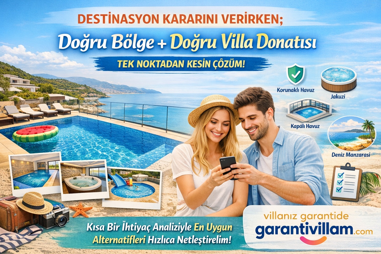 Destinasyon kararını verirken; misafir profiline göre doğru bölge + doğru mevki + doğru villa donatısı (korunaklı havuz, jakuzi, kapalı ısıtmalı havuz, çocuk havuzu, deniz manzarası vb.) eşleşmesini tek noktadan kurgulamak isterseniz, Garanti Villam portföyü üzerinden kısa bir ihtiyaç analiziyle en uygun alternatifleri hızlıca netleştirebiliriz.