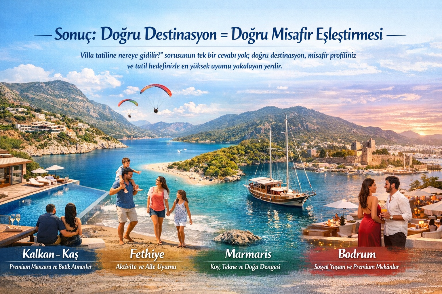“Villa tatiline nereye gidilir?” sorusunun tek bir cevabı yok; doğru cevap, misafir profiliniz ve tatil hedefinizle en yüksek uyumu yakalayan destinasyondur. Premium manzara ve butik atmosfer için Kalkan–Kaş hattı; aktivite ve aile uyumu için Fethiye; koy/tekne ve doğa–deniz dengesi için Marmaris; sosyal yaşam ve premium mekân ekosistemi için Bodrum güçlü seçeneklerdir.
